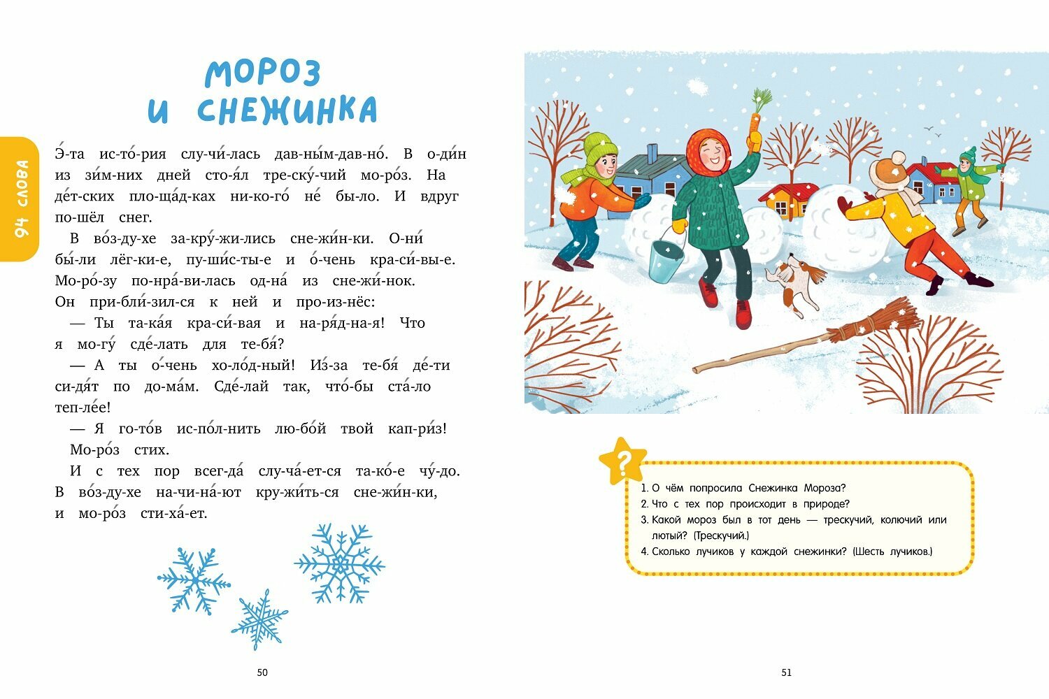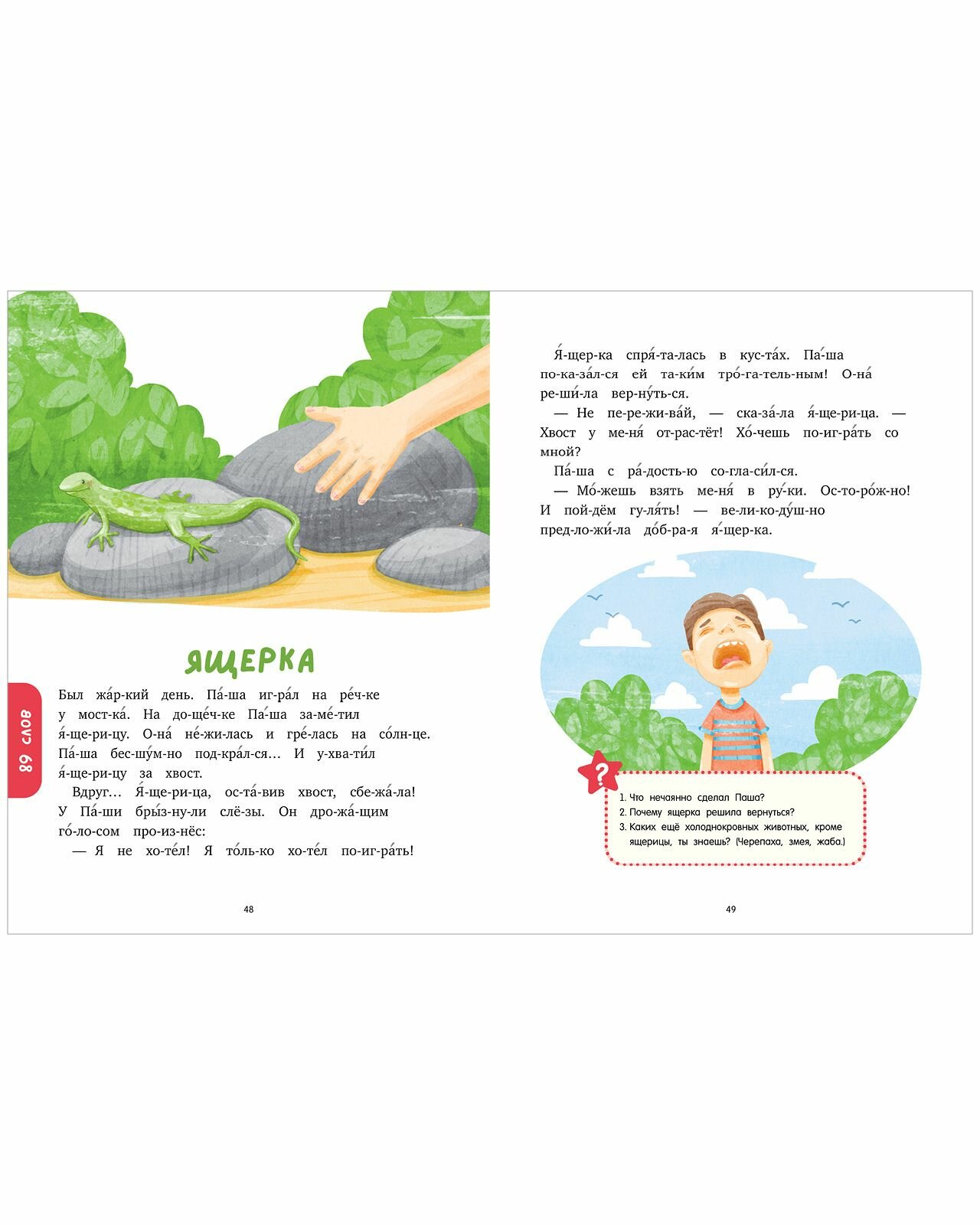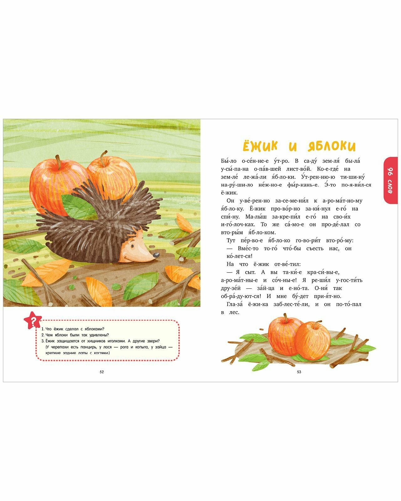 В первых из пятидесяти двух сказок — от 40 до 80 слов, и любую из них малыш сможет прочитать за 3 минуты. К каждому тексту есть готовый список вопросов, чтобы ребенок обязательно осмыслял то, что он прочитал. Далее количество слов плавно увеличивается до 152.