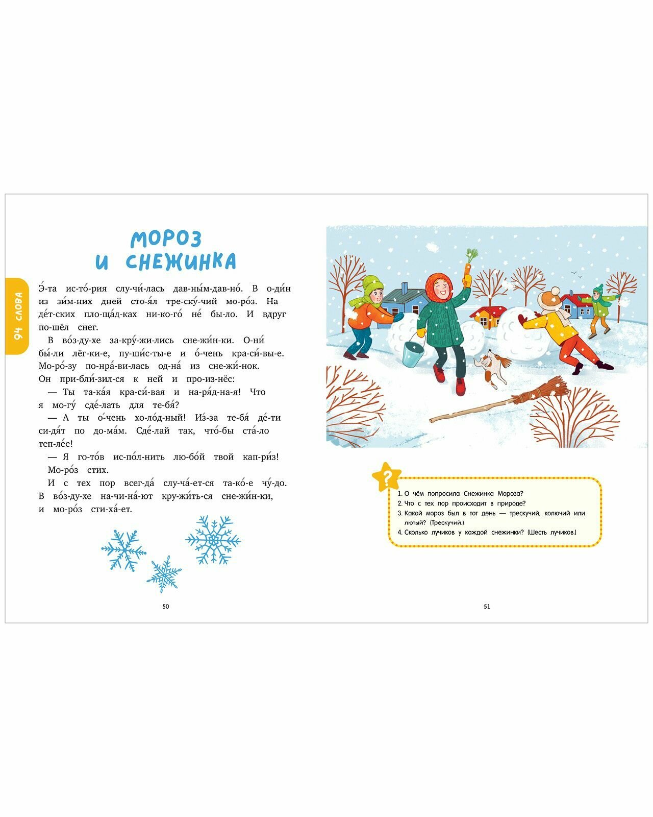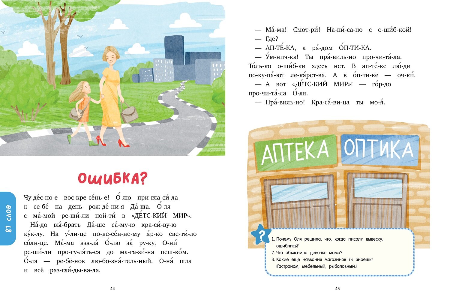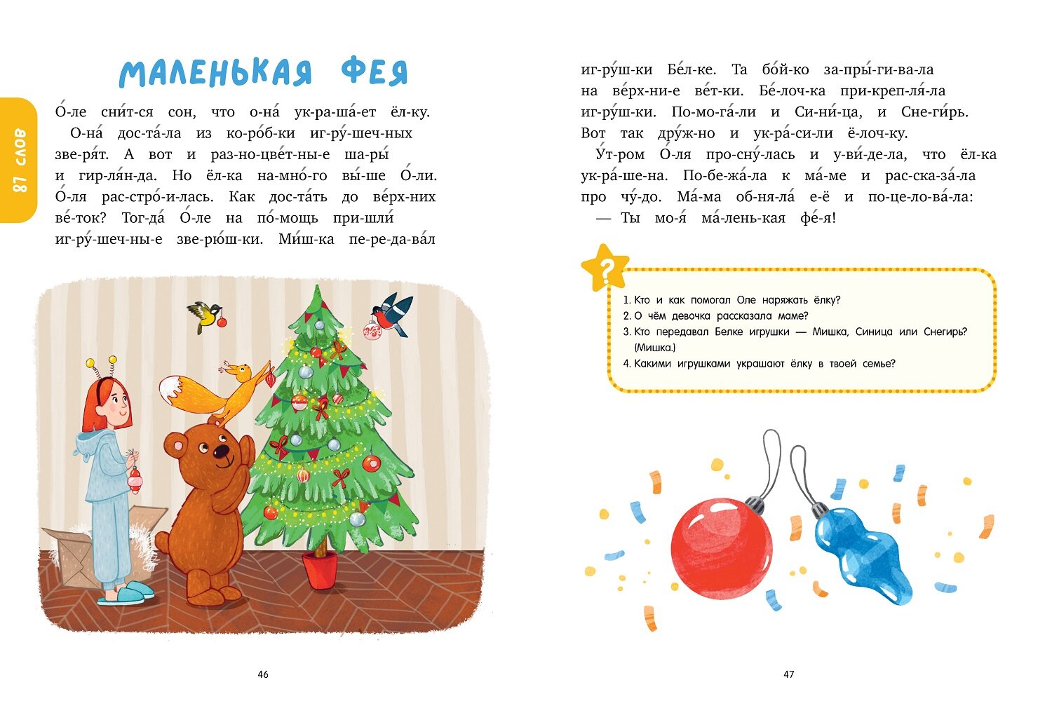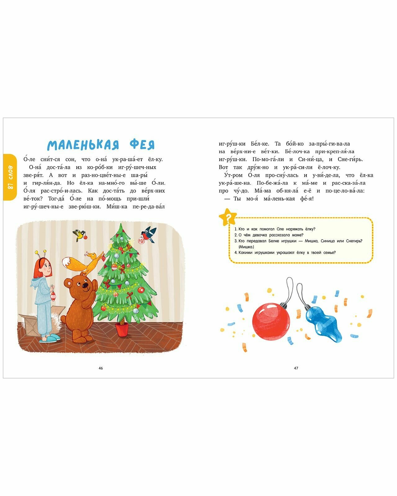 В первых из пятидесяти двух сказок — от 40 до 80 слов, и любую из них малыш сможет прочитать за 3 минуты. К каждому тексту есть готовый список вопросов, чтобы ребенок обязательно осмыслял то, что он прочитал. Далее количество слов плавно увеличивается до 152.
