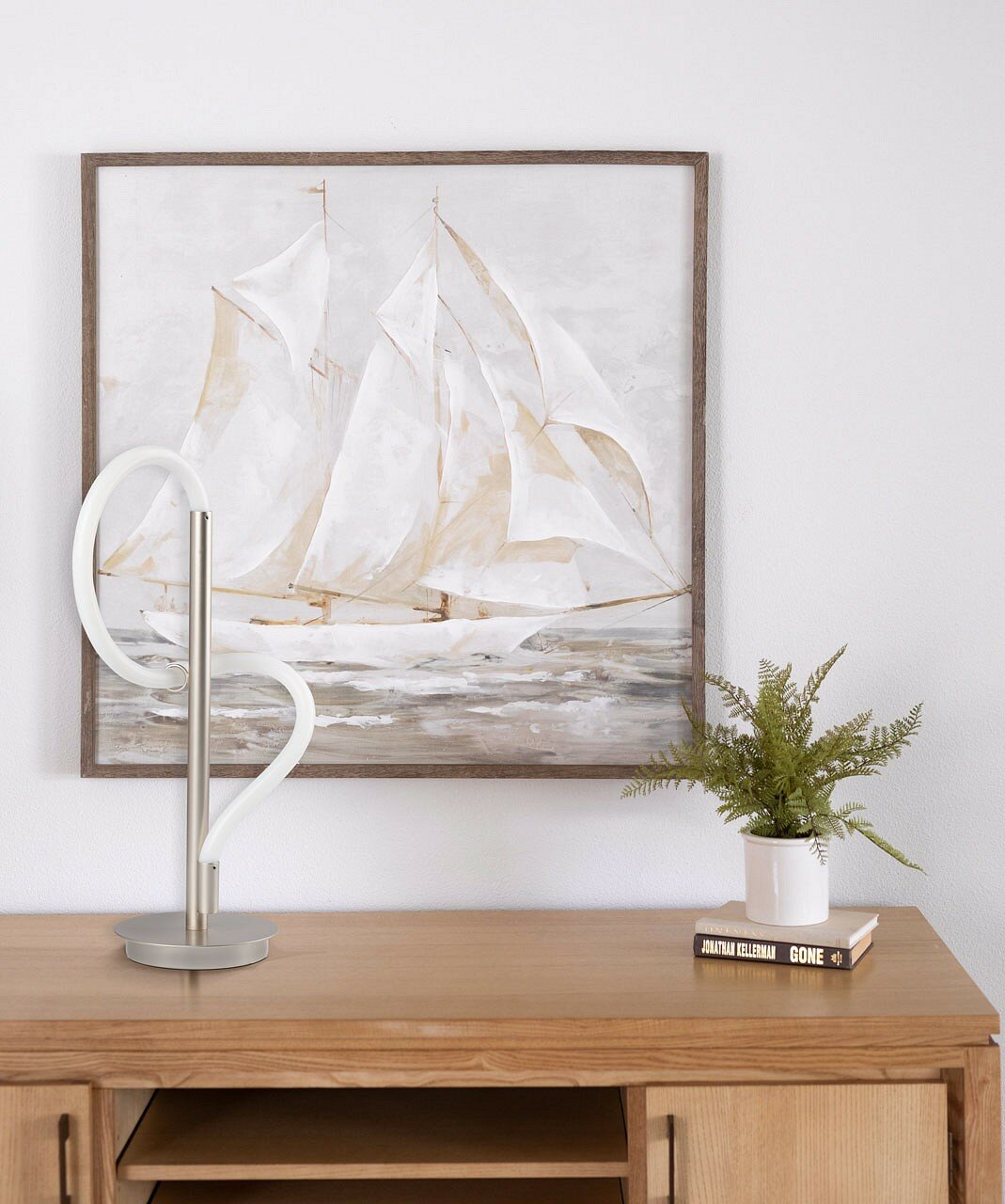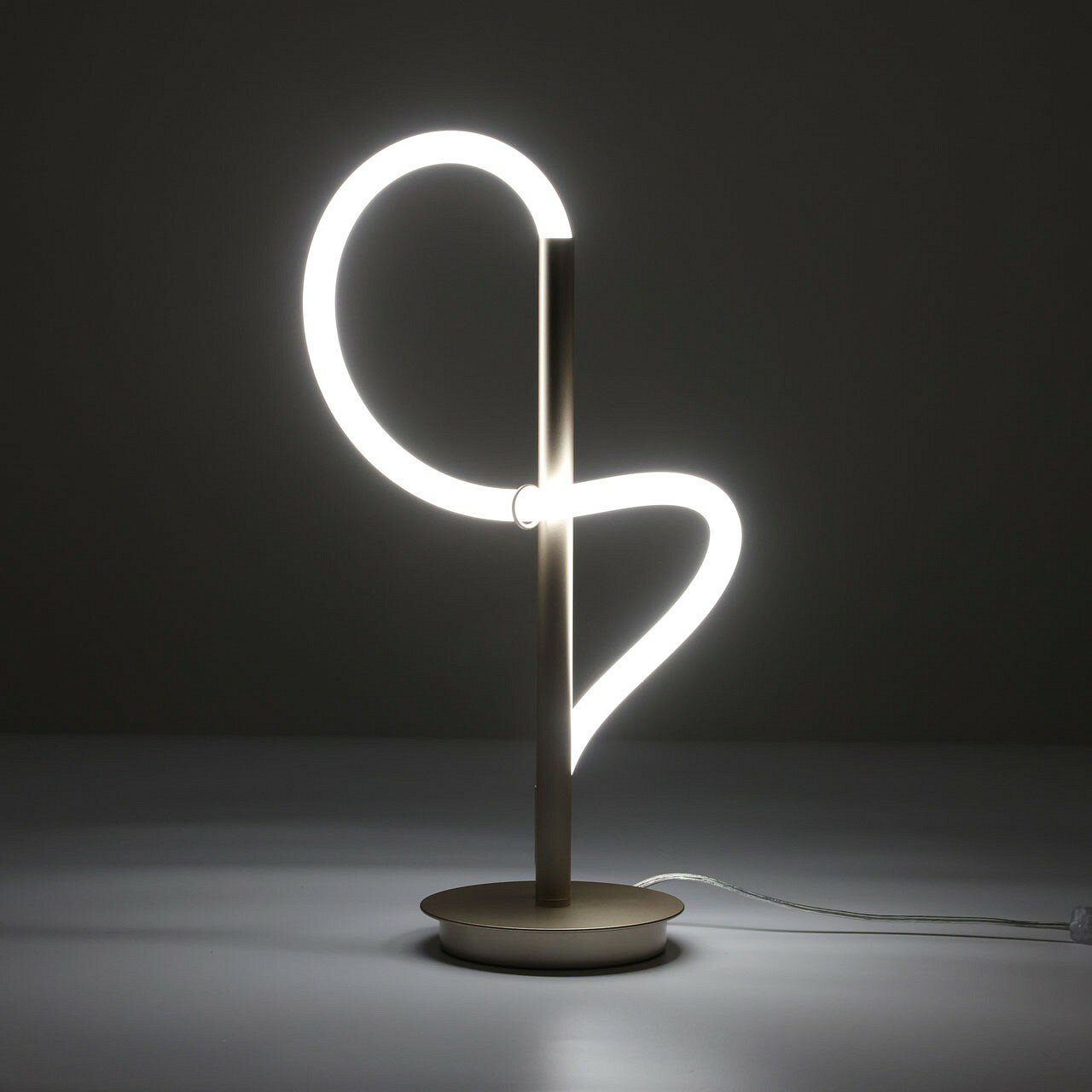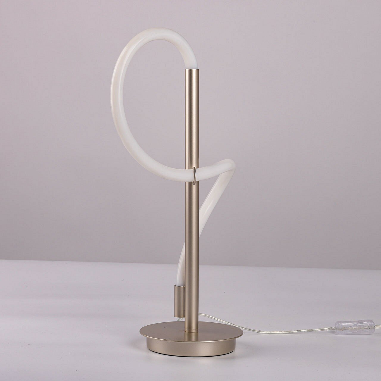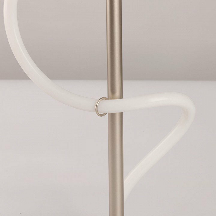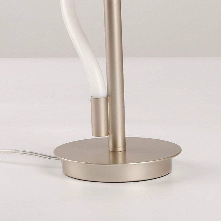 Металлическое основание настольной лампы окрашено в цвет никеля. Гибкий плафон настенного бра выполнен из белого матового силикона.