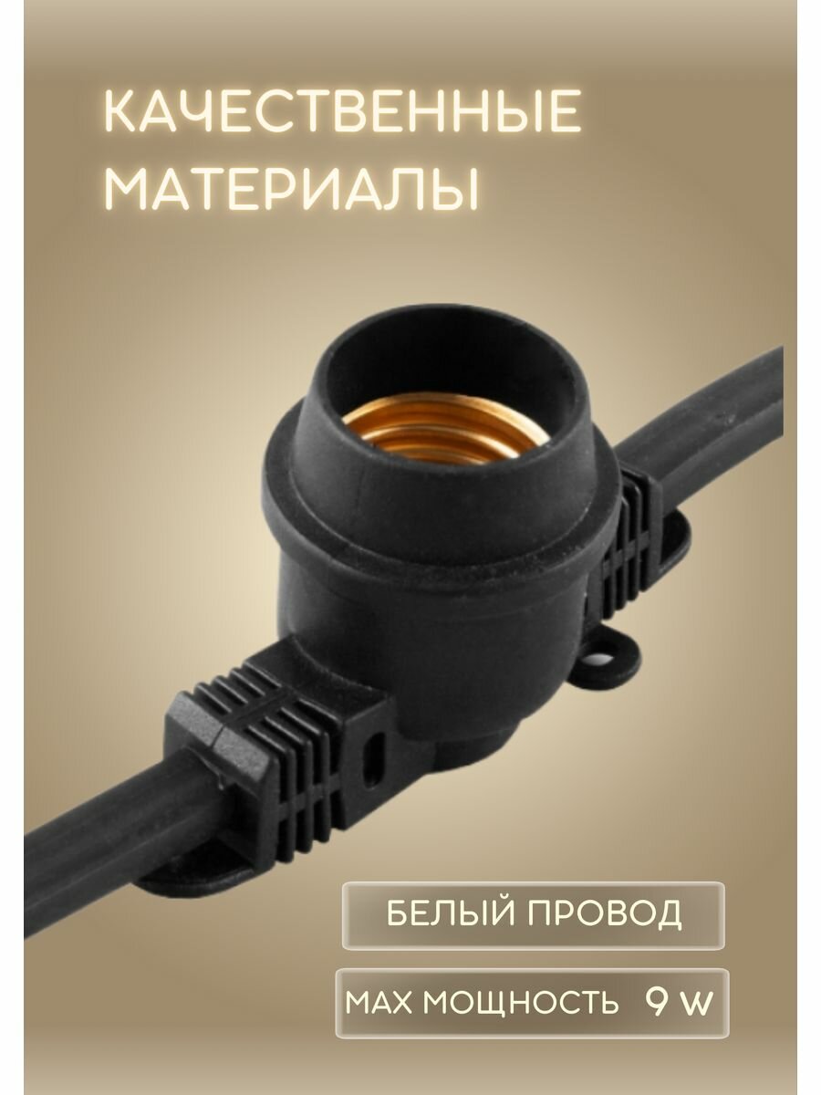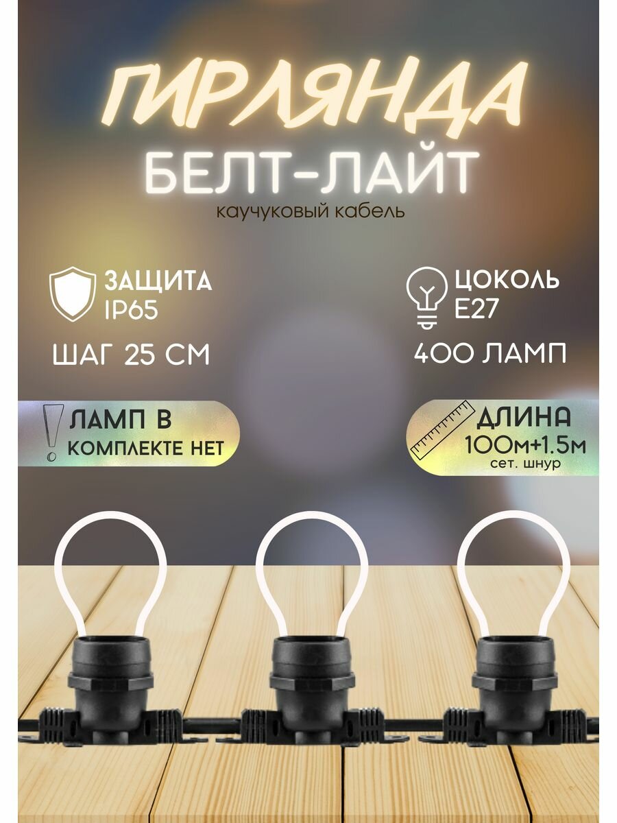 Гирлянда "Белт-лайт" FERON 48167, 100м+1,5м сетевой шнур, цвет черный, патрон E27*400, шаг 25см, 230ВV/50Гц, 16А, IP65, max 9W, сечение 2*1,5мм², материал: каучук,медь,ПВХ,латунь.