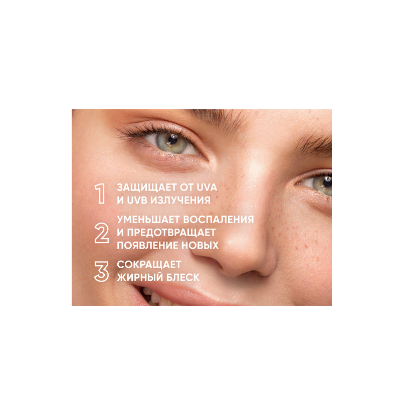 Результат применения: надежная защита от солнца и уменьшение жирного блеска и воспалений.