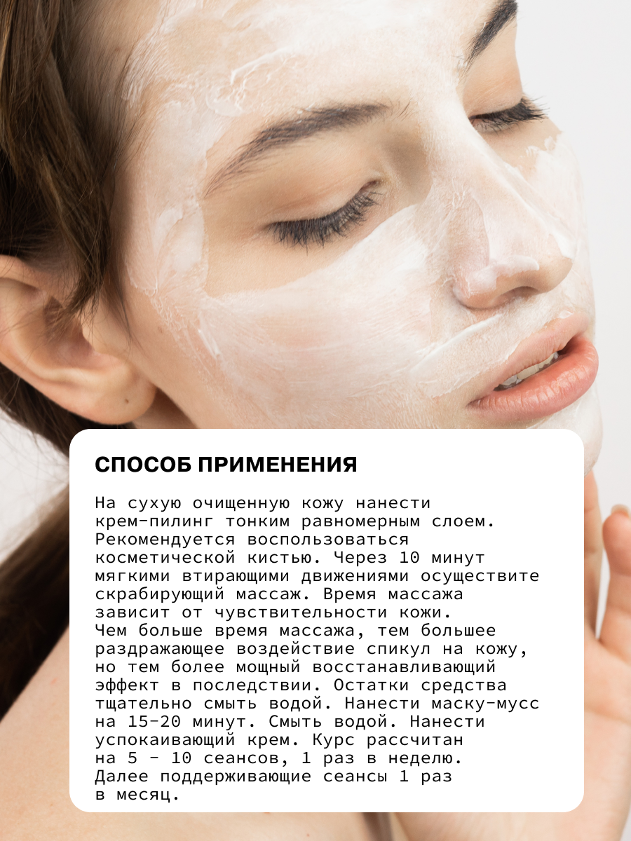 На сухую очищенную кожу нанести крем-пилинг тонким равномерным слоем. Рекомендуется воспользоваться косметической кистью. Через 10 минут мягкими втирающими движениями осуществите скрабирующий массаж. Остатки средства тщательно смыть водой. Нанести маску-мусс на 15-20 минут. Смыть водой. Нанести успокаивающий крем. Процедуру возможно повторять 1 раз в неделю.