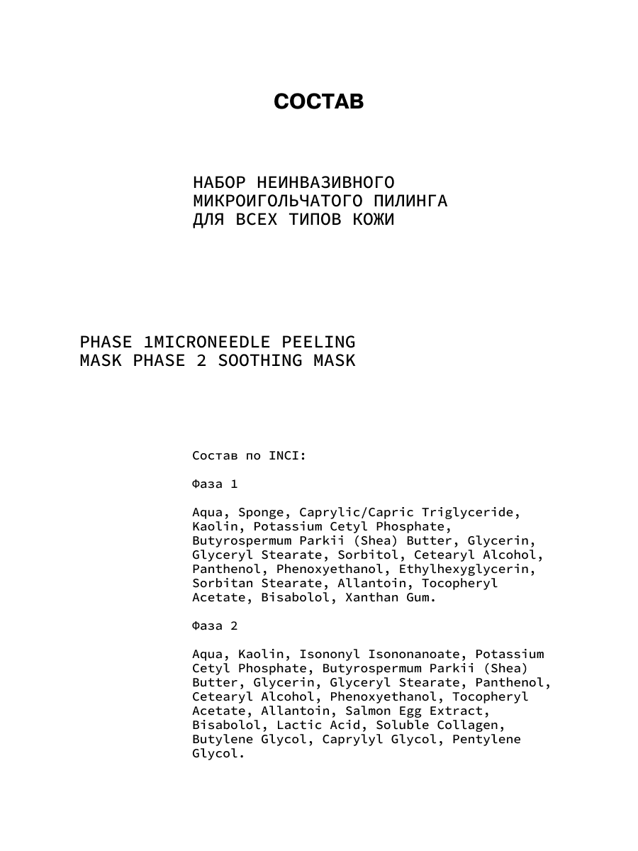 Фаза 2: aqua, kaolin, isononyl isononanoate, potassium cetyl phosphate, butyrospermum parkii (shea) butter, glycerin, glyceryl stearate, panthenol, cetearyl alcohol, phenoxyethanol, tocopheryl acetate, allantoin, salmon egg extract, bisabolol, lactic acid, soluble collagen, butylene glycol, caprylyl glycol, pentylene glycol.