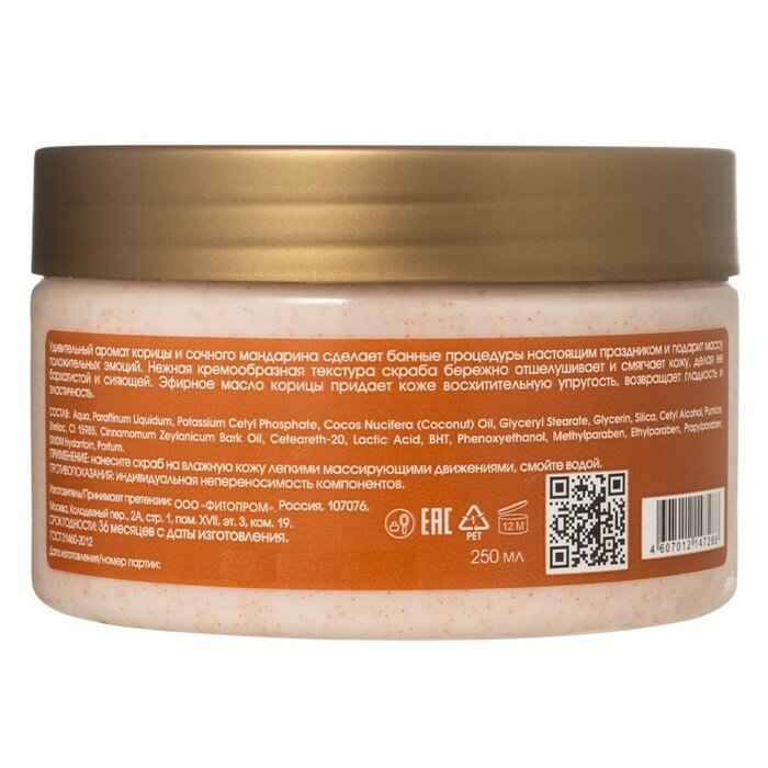 Удивительный аромат корицы и сочного мандарина сделает банные процедуры настоящим праздником и подарит массу положительных эмоций. Нежная кремообразная текстура скраба бережно отшелушивает и смягчает кожу, делая ее бархатистой и сияющей. Эфирное масло корицы придает коже восхитительную упругость, возвращает гладкость и эластичность.