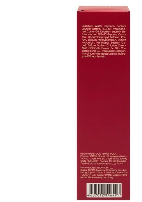 | Состав | Water, Glycerin, Sodium Laureth Sulfate, PEG-40 Hydrogenated Castor Oil, Disodium Laureth Sulfosuccinate, PEG-40 Glyceryl Cocoate, Cocamidopropyl Betaine, Parfum, Sodium methylparaben, DMDM Hydantoin, Panthenol, Sodium Coceth Sulfate, Sodium Chloride, Calendula Officinalis Flower Extract, Tilia Cordata Flower Extract, Hydrolyzed Collagen, Vaccinium Vitis-Idaea Leaf Extract, Hydrolyzed Wheat Protein. |