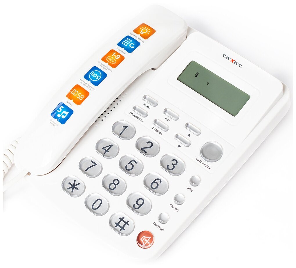 | Прочие функции и свойства | Классический дизайн, нарядный белый цвет. Традиционный подход в конструктивном решении – внимание к эргономичности и удобству в эксплуатации. Большой информативный ЖК-дисплеи с яркой белой подсветкой, контрастность которой можно регулировать. На экране аппарата отображаются день недели, дата и время, а также показания встроенного в телефонный аппарат термометра! Телефон позволяет сохранить один номер экстренного набора, запрограммировав вызов на кнопку SOS. Новинка имеет функцию определения номера вызывающего абонента с памятью на 35 номеров (Caller ID), возможность повтора 9 последних набранных номеров, набор с уложенной трубкой и автодозвон. Пользователям доступен «ночной» режим, который позволяет запрограммировать выключение вызывного акустического сигнала в заданное время. Выбрать мелодию звонка можно из 5 предложенных вариантов. |