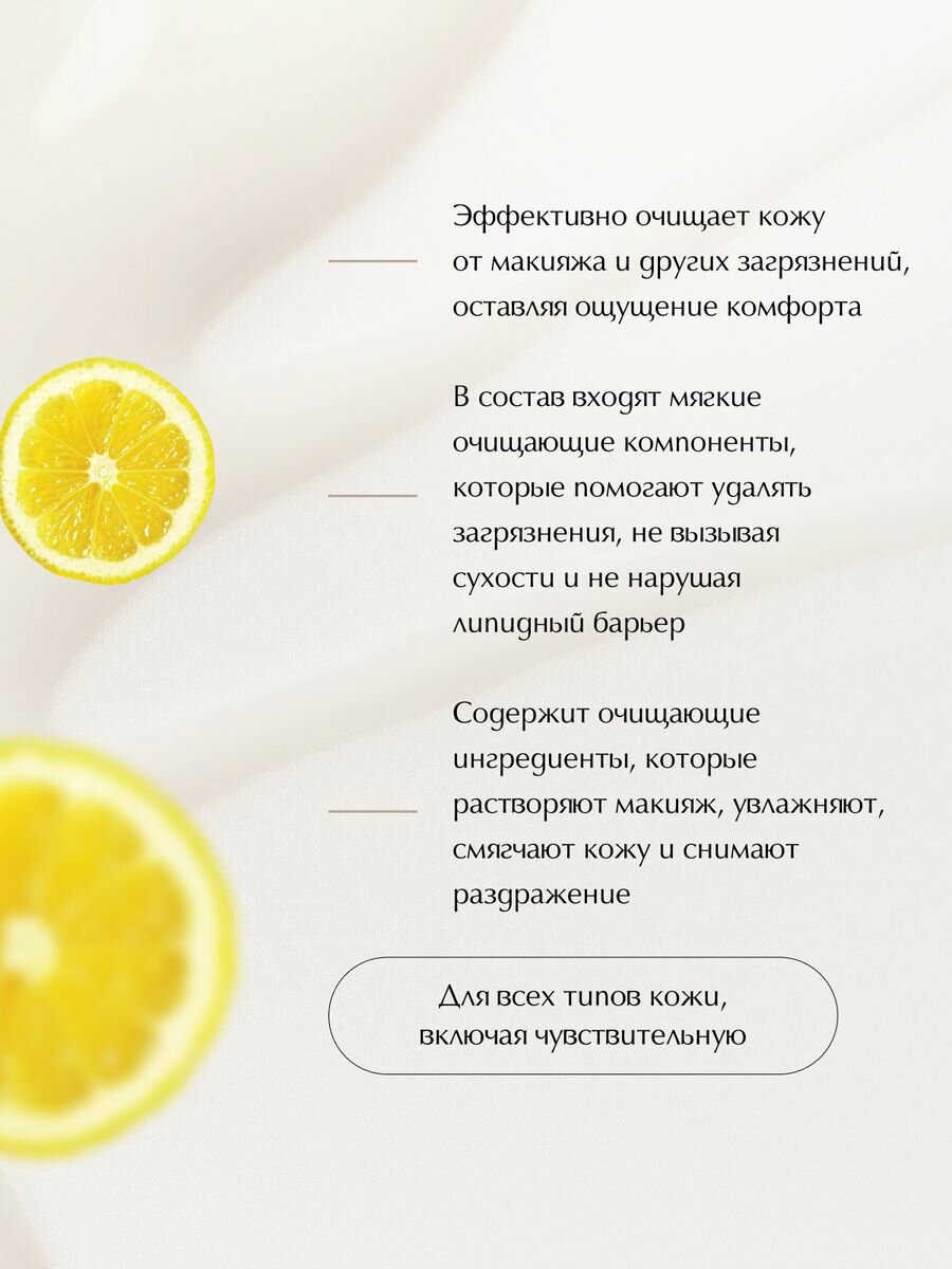 Мягкое молочко эффективно удаляет легкий макияж и загрязнения, не пересушивая, не раздражая и не стягивая кожу. Активные компоненты в составе увлажняют и питают кожу, борются со свободными радикалами. Вместо очищенной воды в формуле используется сок сезонных цитрусов, богатый антиоксидантами. Средство не тестируется на животных и подходит веганам.