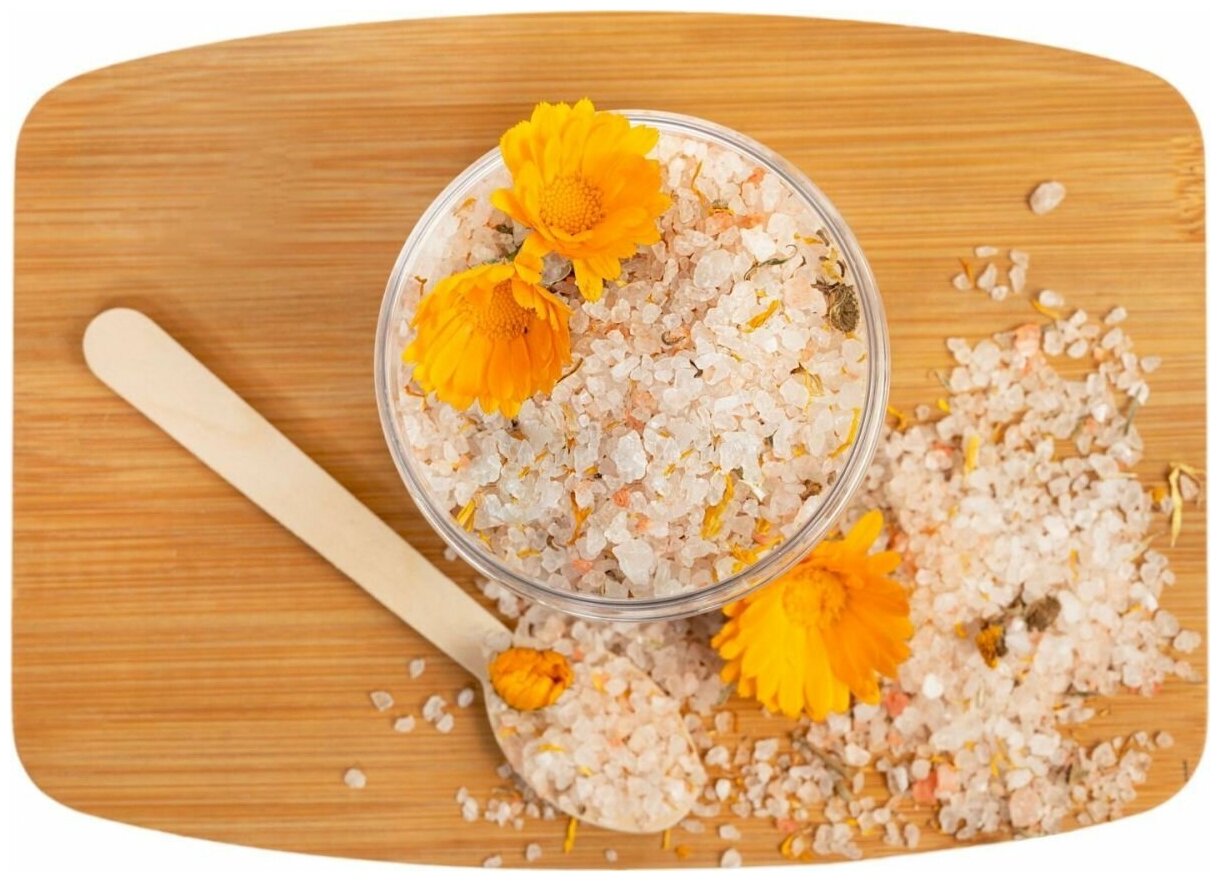 Состав: природная соль (хлорид натрия), сухоцвет цветков календулы, парфюмерная композиция, пищевой краситель CI 15985.
