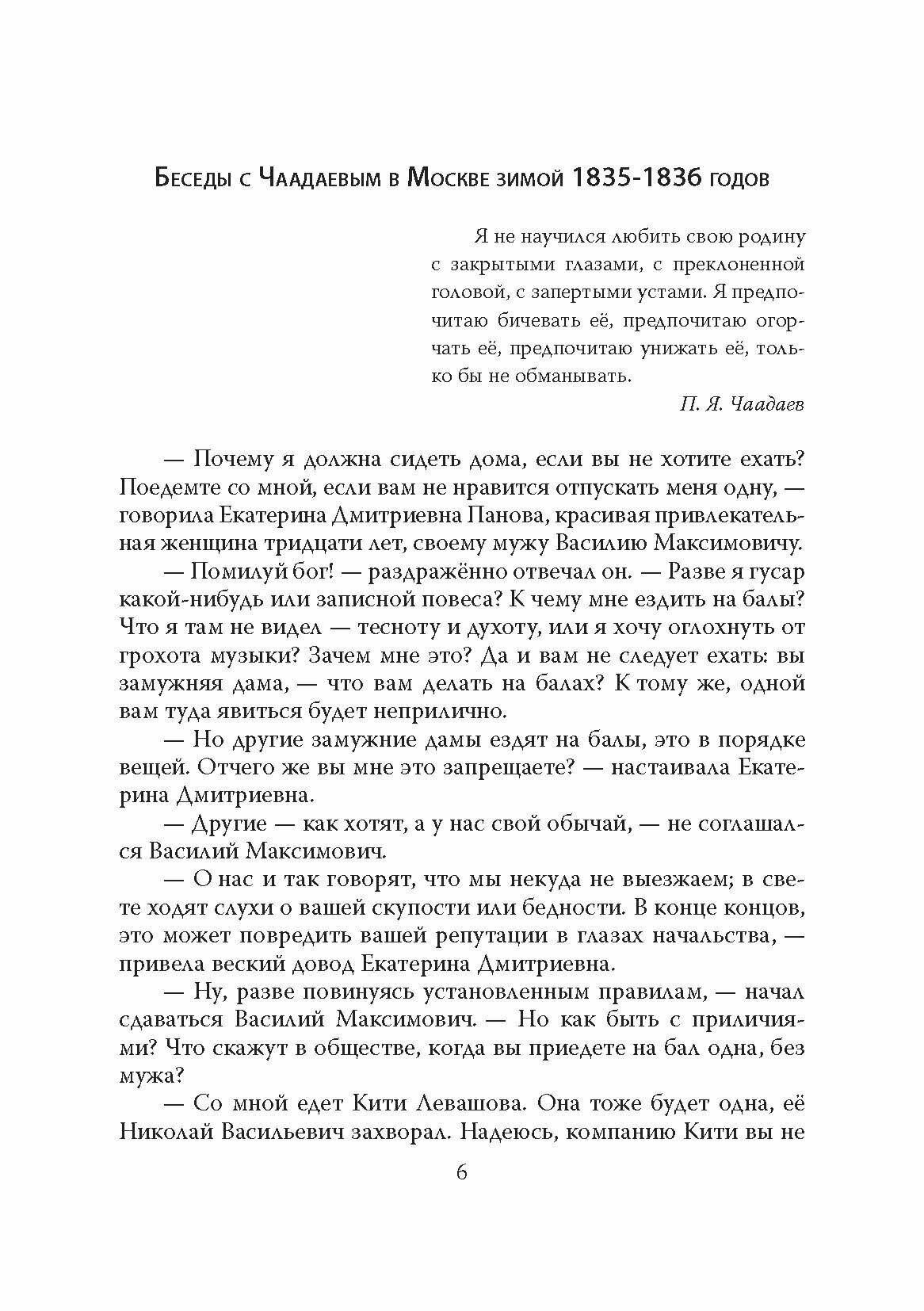 В книге Брячеслава Галимова приводятся сцены из русской жизни этого периода. Книга начинается с драматических обстоятельств, последовавших за написанием П.Я. Чаадаевым "Философических писем" с резкой оценкой существующего в России политического строя, вследствие чего Чаадаева объявили сумасшедшим под домашним надзором, а адресатку его писем искалечили в сумасшедшем доме.