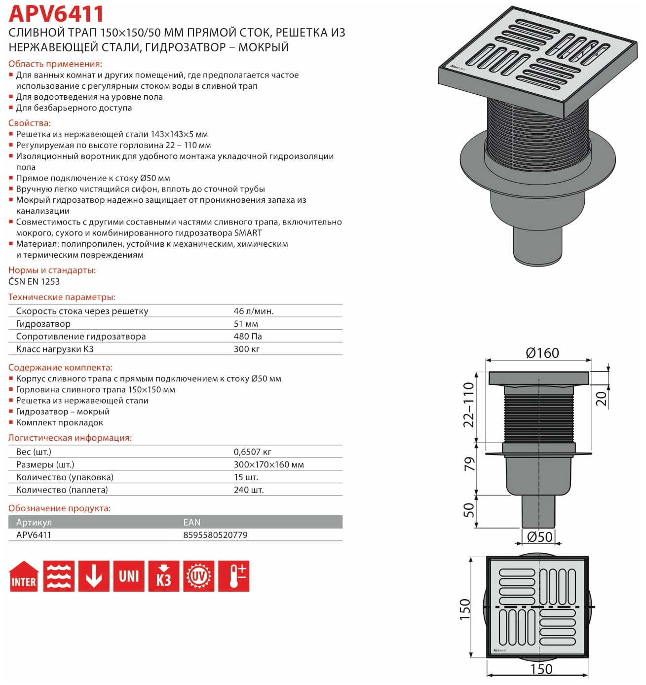 Сливной трап 150 150/50, подводка боковая, решетка нержавеющая сталь, гидрозатвор мокрый. Регулируемая по высоте горловина 22110 мм. Изоляционный воротник для удобного монтажа гидроизоляции пола. Боковое подключение к канализационному стоку 50 мм. Вручную легко чистящийся сифон, вплоть до сточной трубы. Мокрый гидрозатвор надежно защищает от проникновения запаха из канализации. Совместимость с другими составными частями сливного трапа, включительно мокрого, сухого и комбинированного гидрозатвора SMART. Материал: полипропилен, устойчивый к механическим, химическим и термическим повреждениям. Материал: нержавеющая сталь AISI 304, DIN 1.4301