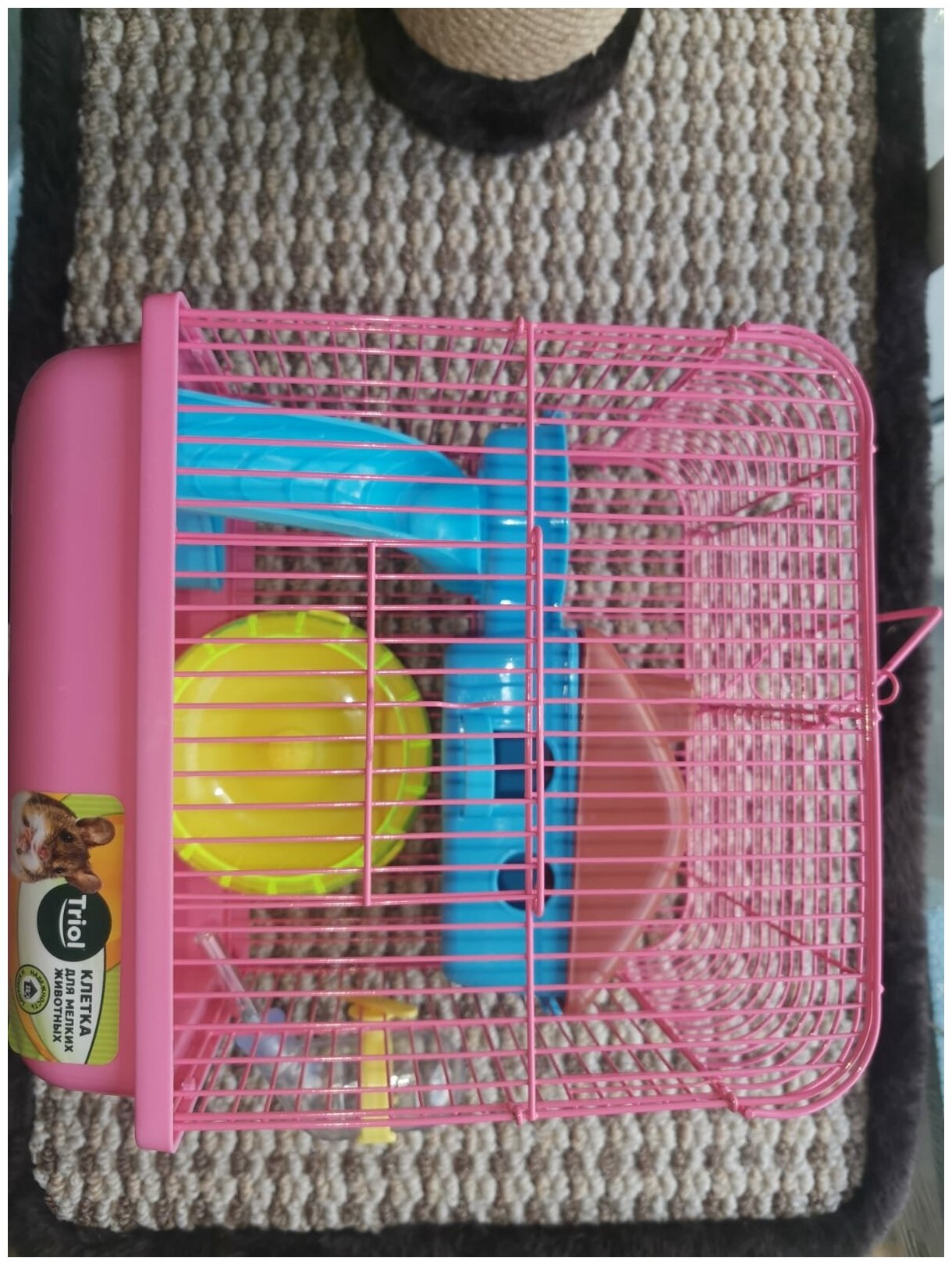 Складная компактная цветная клетка с прочным металлическим каркасом. Она не занимает много места и отлично подходит для мелких домашних животных вроде крыс, мышей и хомяков. В комплектацию изделия также входят: пластиковая миска, поилка с носиком, горка со второго яруса на первый, вместительный домик и беговое колесо. Клетка также оборудована специальным пластиковым наружным поддоном, облегчающим процесс уборки, а удобная ручка сверху максимально упрощает транспортировку изделия.