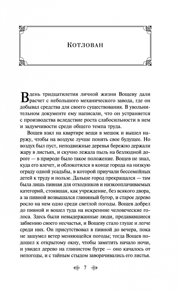 Книга включает в себя знаковые рассказы Платонова, центральным же произведением является \"Котлован\" - грандиозная история о бытии души, о человеке, загнанном в рамки неутного мира, пытающегося отстоять свою личность. Язык у Платонова совершенно потрясающий, оригинально звучащий. Качество сборника вызывает исключительно положительные впечатления: приятная на ощупь шероховатая обложка, качественная полиграфия, не самая тонкая бумага, крепкий переплет