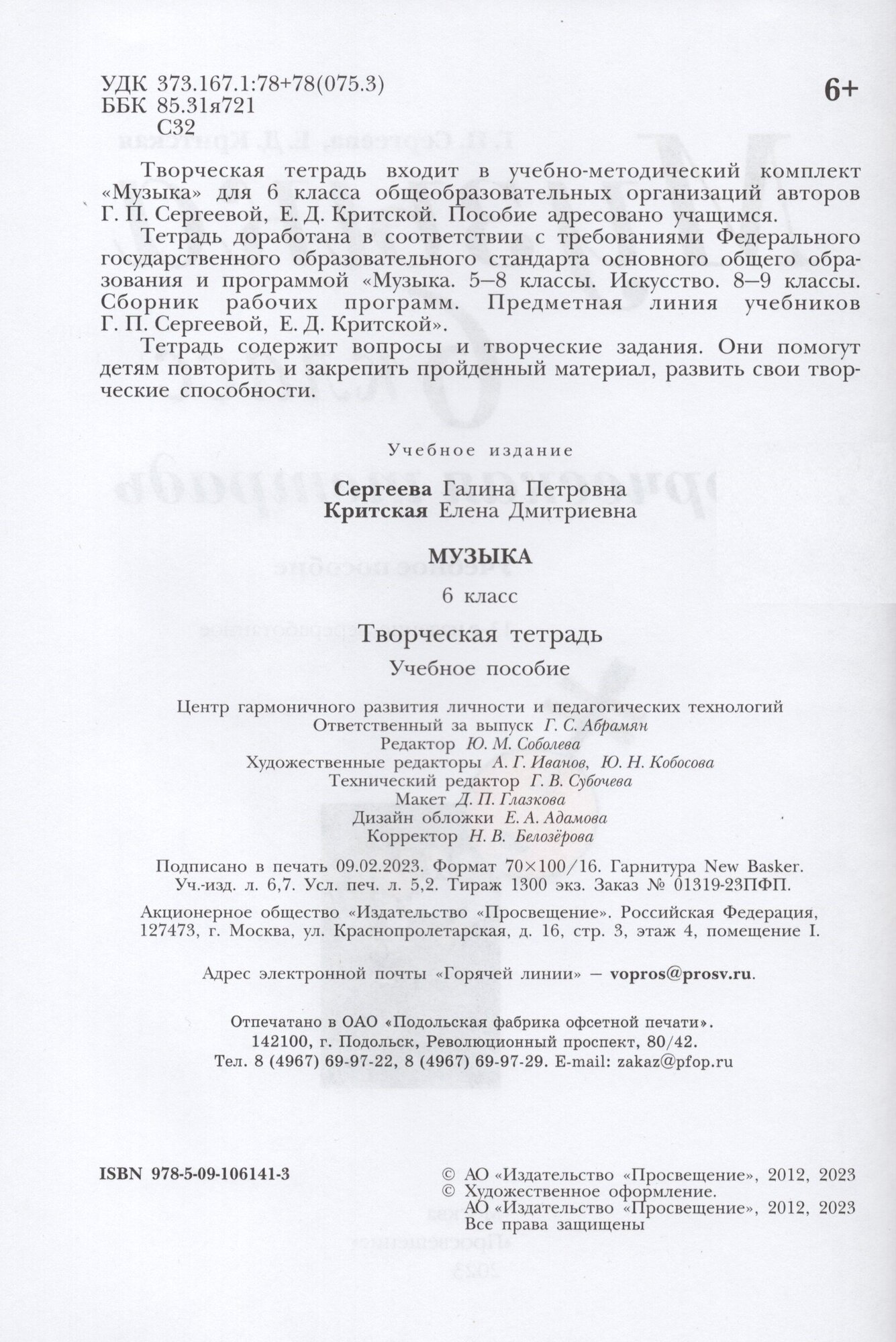 Музыка. Творческая тетрадь. 6 класс (Галина Петровна Сергеева, Елена Дмитриевна Критцкая); Просвещение, 2025