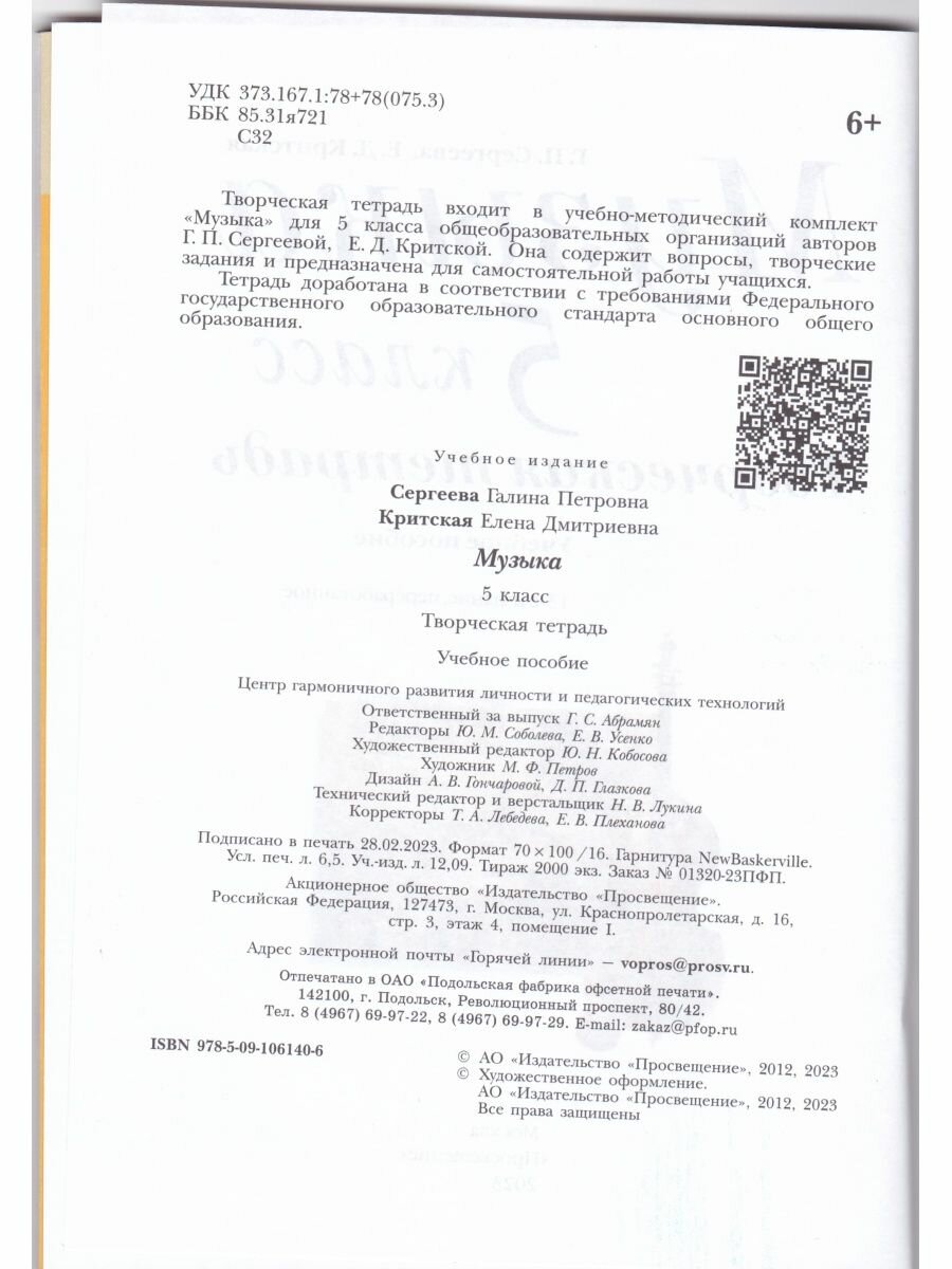 Музыка. Творческая тетрадь. 5 класс (Галина Петровна Сергеева, Елена Дмитриевна Критцкая); Просвещение, 2026