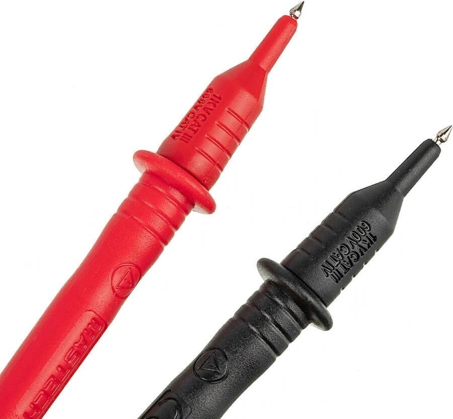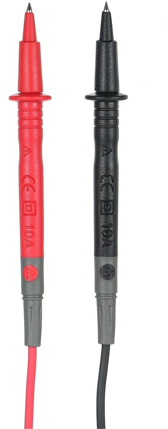 Комплект измерительных проводов RGK включает в себя красный и черный проводники, каждый из которых снабжен прямым закрытым коннектором типа «банан» и несъемным щупом с 17-миллиметровым игольчатым жалом.Кабели из набора соответствуют категории защиты от перенапряжений CAT III 1000 V и способны выдерживать максимально допустимую силу тока в долговременном режиме до 10 А. Их можно использовать совместно с мультиметрами, токовыми клещами с функцией контактных измерений и другими приборами, оснащенными соответствующим входным интерфейсом.Особенности измерительных проводов RGK Кабели метровой длины в силиконовой изоляции не теряют гибкость при выполнении работ в диапазоне температур от –15 до +40°C. Съемные защитные колпачки длиной 12 мм уменьшают выступающую контактную часть щупов, повышая безопасность измерений за счет минимизации вероятности случайного замыкания. Ограничительные барьеры квадратной формы на щупах исключают их скатывание при размещении на наклонных поверхностях. Протекторы на корпусах щупов и коннекторов не допускают залома кабелей, обеспечивая высокий эксплуатационный ресурс. Рифление в месте хвата позволяет удобно работать в защитных перчатках, препятствуя выскальзыванию.