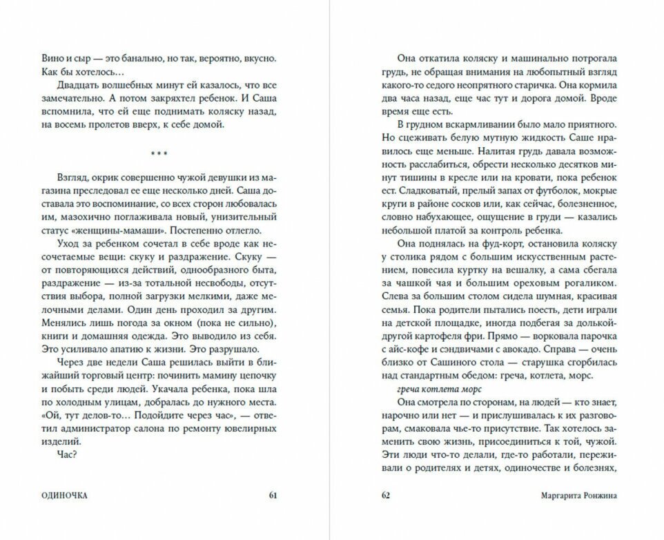 «Одиночка» – проза, близкая к поэзии. Эта книга буквально живет за счет особенного, отчасти экспериментального ритма. Здесь он не менее важен, чем подбор слов и меткость сравнений. Вынь его – и все развалится, станет скучно, обыденно. К тому, же Маргарита Ронжина – не просто дивный стилист. Автор она умело работает с деталями, отсылками, сравнениями (чего стоит один «ребенок-альденте» или «красная тишина набережной»). Всю книгу читателя преследуют яркие эпизодические образы, которые Маргарите Ронжиной удаются особенно удачно: будь то добрая пожилая соседка, или парень в желтой шапке, или размалеванные макияжем «куклы» в фуд-корте. Иногда образы эти становятся реперными точками истории.