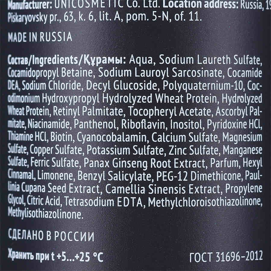 | Состав | Aqua, Sodium Laureth Sulfate, Cocamidopropyl Betaine, Sodium Lauroyl Sarcosinate, Cocamide DEA, Sodium Chloride, Decyl Glucoside, Polyquaternium-10, Cocodimonium Hydroxypropyl Hydrolyzed Wheat Protein, Hydrolyzed Wheat Protein, Retinyl Palmitate, Tocopheryl Acetate, Ascorbyl Palmitate, Niacinamide, Panthenol, Riboflavin, Inositol, Pyridoxine HCl, Thiamine HCl, Biotin, Cyanocobalamin, Calcium Sulfate, Magnesium Sulfate, Copper Sulfate, Potassium Sulfate, Zinc Sulfate, Manganese Sulfate, Ferric Sulfate, Panax Ginseng Root Extract, Parfum, Hexyl Cinnamal, Limonene, Benzyl Salicylate, PEG-12 Dimethicone, Paullinia Cupana Seed Extract, Camellia Sinensis Extract, Propylene Glycol, Citric Acid, Tetrasodium EDTA, Methylchloroisothiazolinone, Methylisothiazolinone. |
