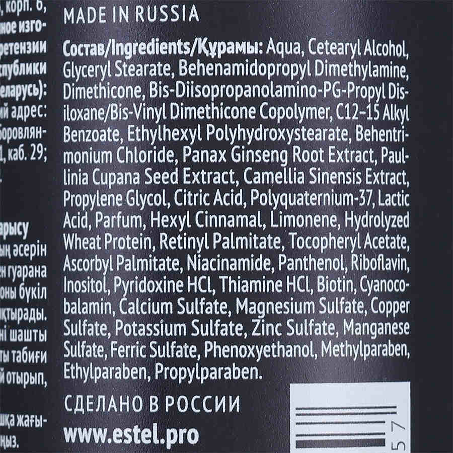 | Состав | Aqua, Cetearyl Alcohol, Glyceryl Stearate, Behenamidopropyl Dimethylamine, Dimethicone, Bis-Diisopropanolamino-PG-Propyl Disiloxane / Bis-Vinyl Dimethicone Copolymer, C12–15 Alkyl Benzoate, Ethylhexyl Polyhydroxystearate, Behentrimonium Chloride, Panax Ginseng Root Extract, Paullinia Cupana Seed Extract, Camellia Sinensis Extract, Propylene Glycol, Citric Acid, Polyquaternium-37, Lactic Acid, Pаrfum, Hexyl Cinnamal, Limonene, Hydrolyzed Wheat Protein, Retinyl Palmitate, Tocopheryl Acetate, Ascorbyl Palmitate, Niacinamide, Panthenol, Riboflavin, Inositol, Pyridoxine HCl, Thiamine HCl, Biotin, Cyanocobalamin, Calcium Sulfate, Magnesium Sulfate, Copper Sulfate, Potassium Sulfate, Zinc Sulfate, Manganese Sulfate, Ferric Sulfate, Phenoxyethanol, Methylparaben, Ethylparaben, Propylparaben. |