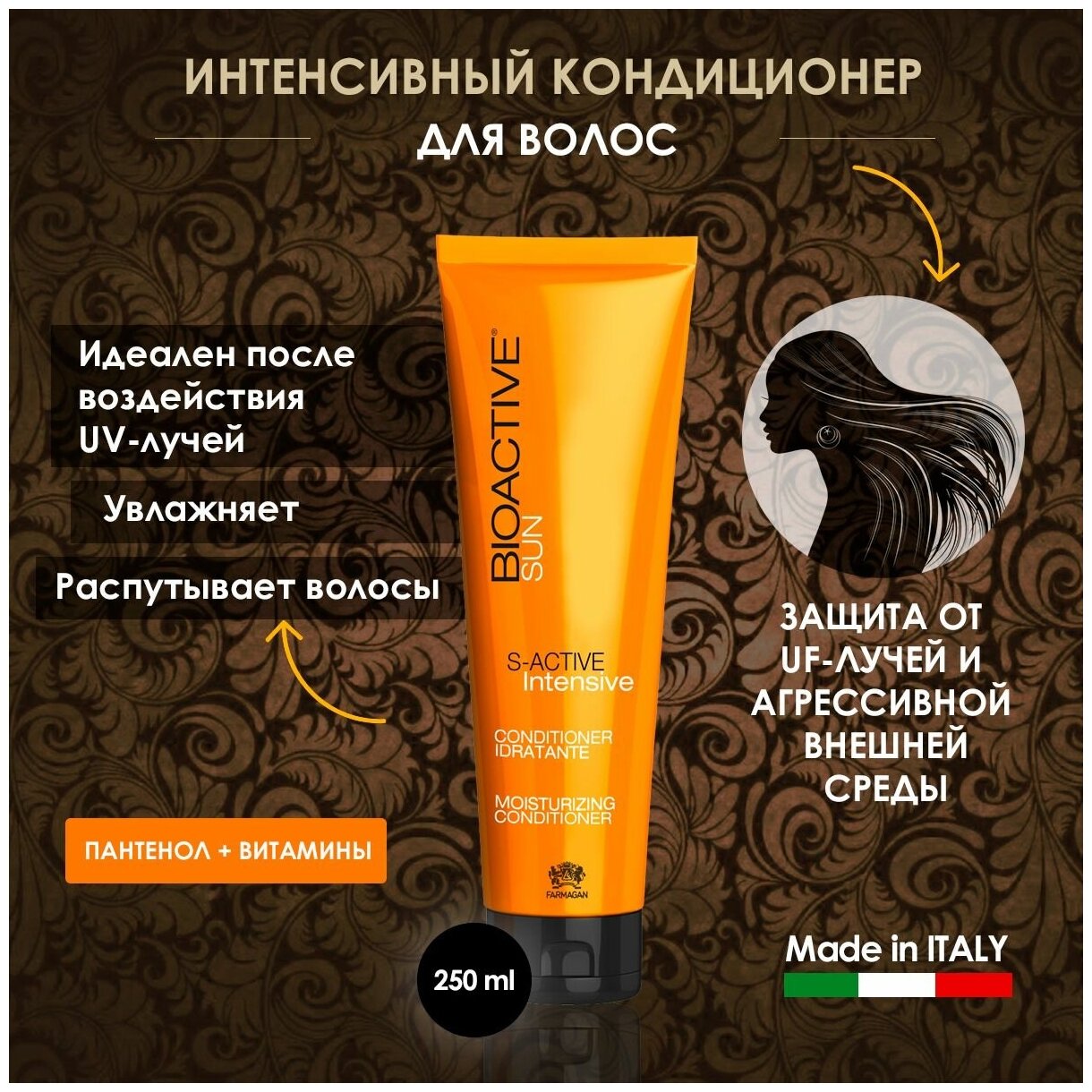 Интенсивный увлажняющий кондиционер для волос Bioactive Sun S-Active Conditioner Moisturizing итальянской марки Farmagan мягко восстанавливает и освежает локоны любого типа. Он бережно воздействует на кожный покров, улучшает состояние фолликулов, способствует росту новых здоровых прядей.Средство рекомендовано для использования после воздействия солнечных лучей, солёной или хлорированной воды. За счёт пантенола в составе, волосы и кожа головы получают необходимую влагу и комплекс питательных веществ, растительные масла и витамины делают локоны более шелковистыми, упругими, гладкими и эластичными.Кондиционер облегчает расчёсывание прядей и укладку, возвращает им сияющий и здоровый внешний вид. Ключевыми ингредиентами формулы являются также: масла рисовых отрубей и жожоба, витамины Е и В5.