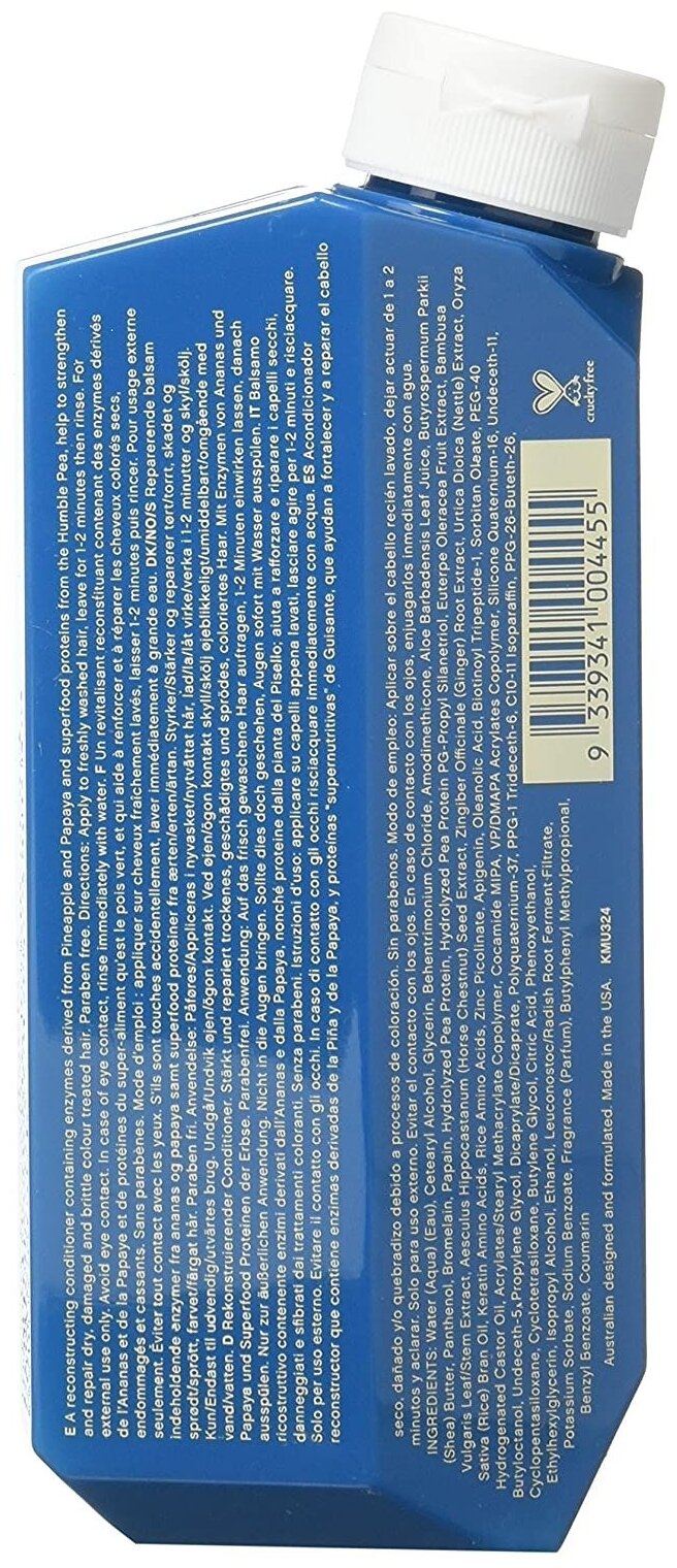 Кондиционер Kevin.Murphy Repair-Me.Rinse насыщает волосы протеинами, укрепляя и уплотняя их. В составе средства: аминокислоты шелка, аргинин, лизин, протеин зеленого горошка, энзим ананаса, экстракты папайи, алоэ, фрукта пау пау, а также листа бамбука. Аминокислоты шелка и аргинин улучшают рост волос и обновляют их на клеточном уровне. Лизин укрепляет волосы. Протеин зеленого горошка питает и уплотняет. Энзим ананаса сглаживает поврежденные участки волос. А растительные экстракты в Repair-Me.Wash наделяют пряди здоровым блеском. Кроме того, Kevin.Murphy Repair-Me.Rinse оберегает волосы от Уф-лучей.