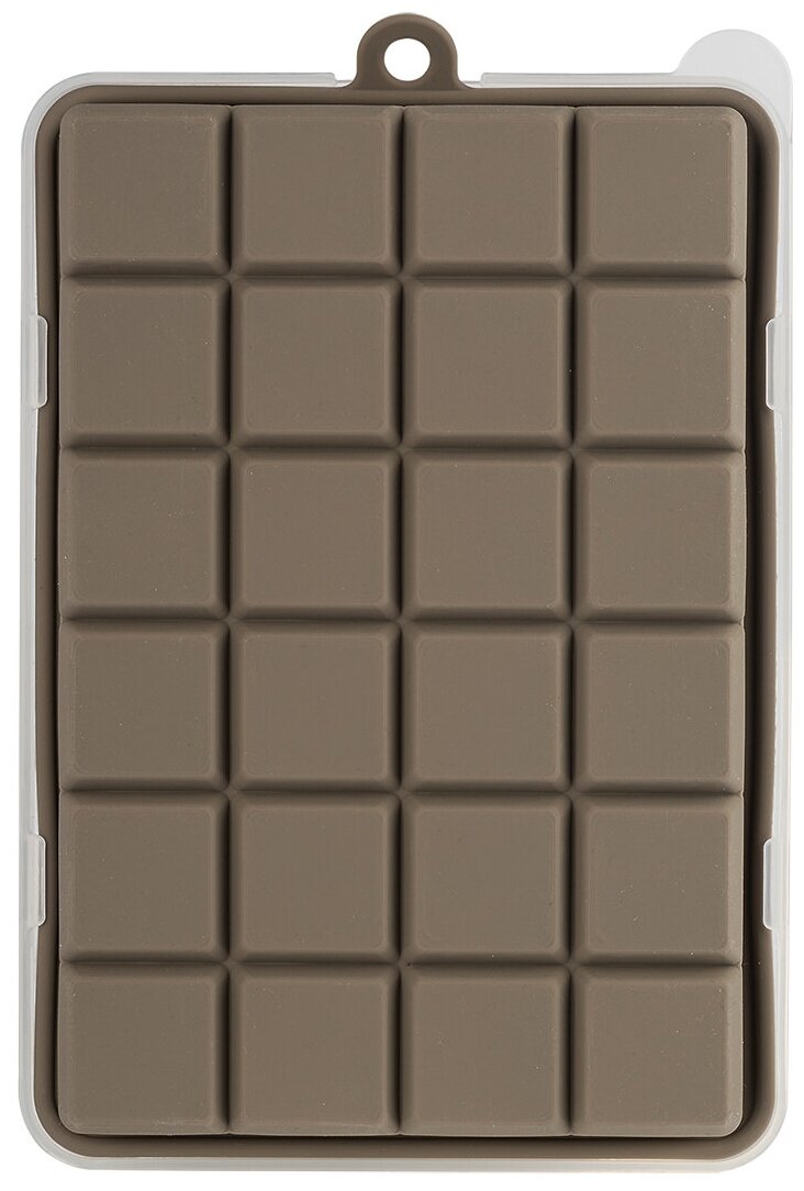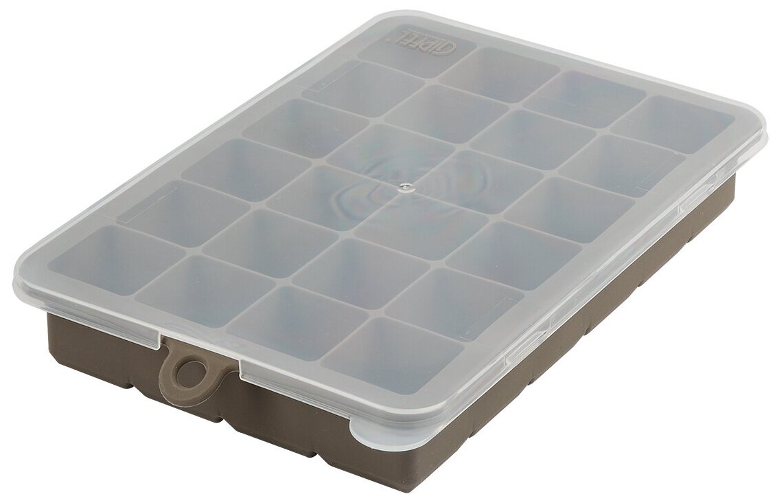 Форма для льда GIPFEL ECO 51531. Размер 12,5x18 см. Сделана из силикона коричневого цвета и имеет 24 ячейки. Крышка в комплекте. Размер кубика льда 2,5х2,5х2,5 см.