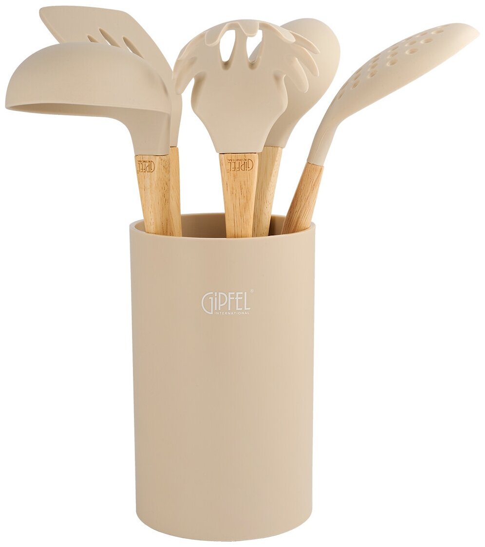 Набор кухонных инструментов GIPFEL MOLTO 51661. В наборе 6 предметов: лопатка с прорезями, ложка, половник, шумовка, ложка для спагетти, подставка. Ручки инструментов изготовлены из дерева гевеи. Рабочая часть из силикона, что позволит использовать инструменты с антипригарной посудой. Вес 822 гр.
