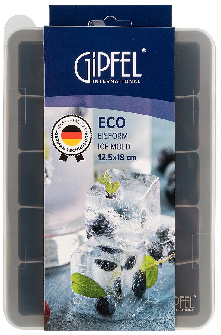 Форма для льда GIPFEL ECO 51530. Размер 12,5x18 см. Сделана из силикона коричневого цвета и имеет 15 ячеек. Крышка в комплекте.