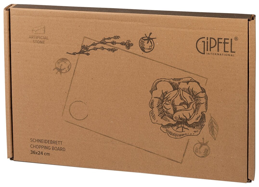 Доска разделочная GIPFEL 51807. Размер 36х24 см. Доска изготовлена из искусственного камня. Доска не впитывает влагу и запахи, на ее поверхности не размножаются бактерии. Искусственный камень – прочный и долговечный материал, который не снижает остроту ножей даже при частом использовании. Доску можно использовать не только для измельчения продуктов, но и для сервировки. Для очищения используйте неабразивные чистящие средства и мягкие губки для посуды. Доску рекомендуется мыть вручную. Доска упакована в подарочную коробку.
