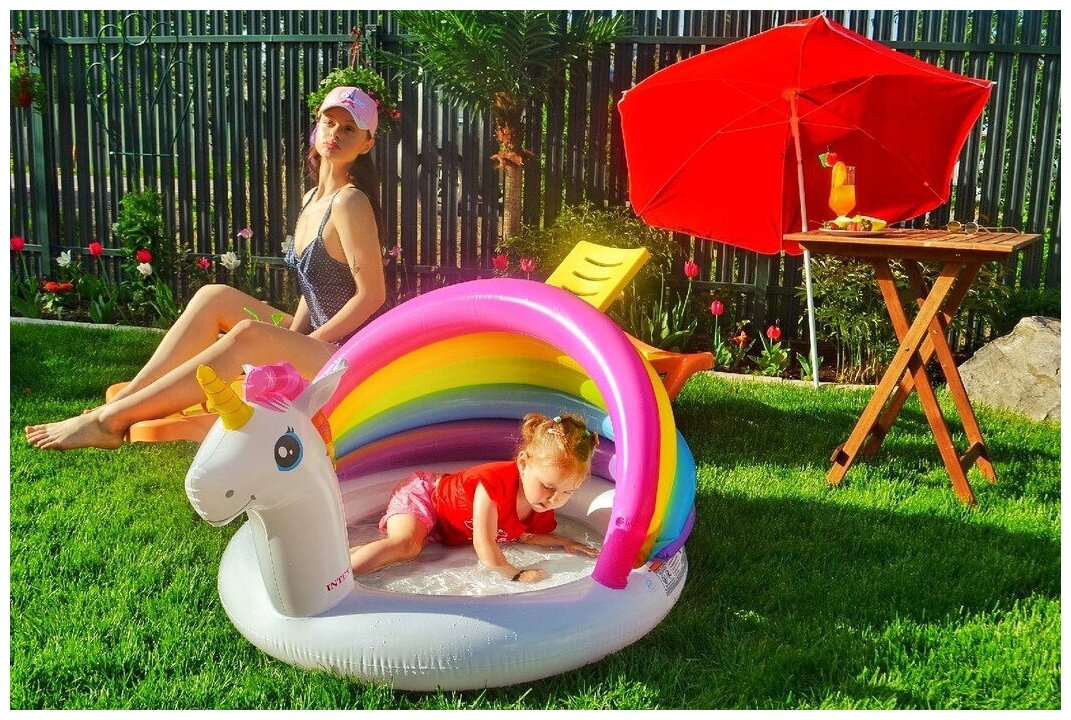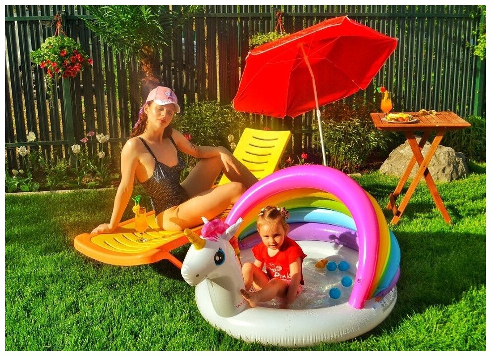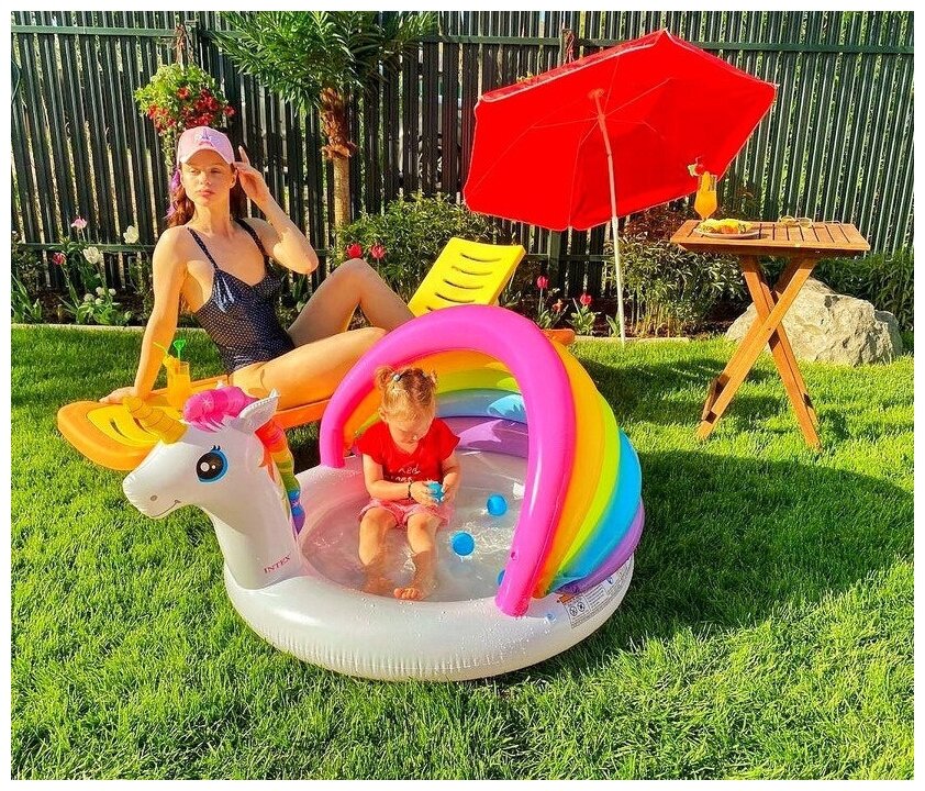 Правильно выбрать надувной детский бассейн на дачу - задачка не из простых! Он должен быть безопасным и надежным, давать детям возможность в удовольствие барахтаться в теплой воде, не загромождая при этом половину участка и, главное, нравиться малышне. Детский бассейн Интекс удовлетворяет требованиям по всем 5 пунктам! Выполненный в виде белоснежного пони с символическим радужным хвостом, он сам по себе станет украшением двора, а использованный по прямому назначению навсегда покорит сердца младших членов семьи. К тому же надувное дно делает купание в Единорожке еще приятнее, а цветастый хвост не только радует глаз, но и защищает от теплового удара и солнечных ожогов, что особенно актуально, если вы собираетесь приобрести детский бассейн для дачи или двора частного дома. В любое время дня в него будут стараться залезть маленькие купальщики! Размер в надутом состоянии: 127*102*69 см.