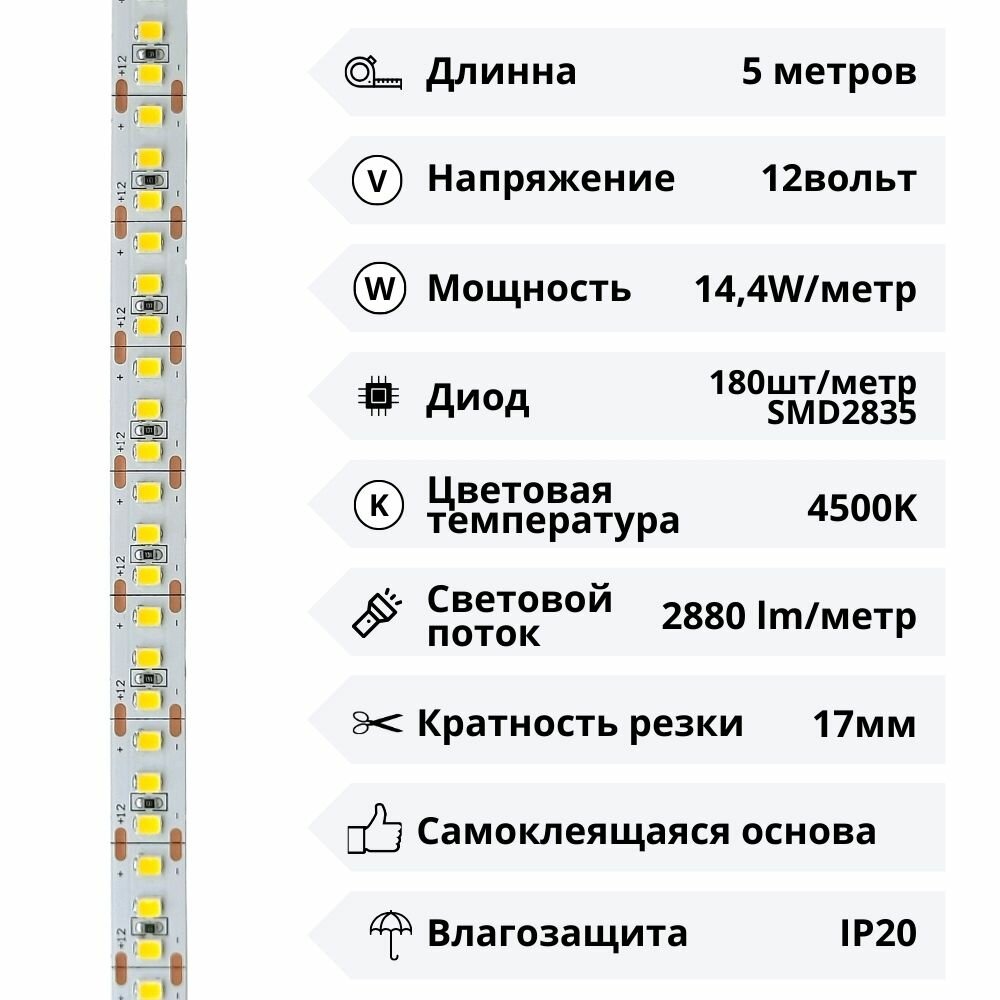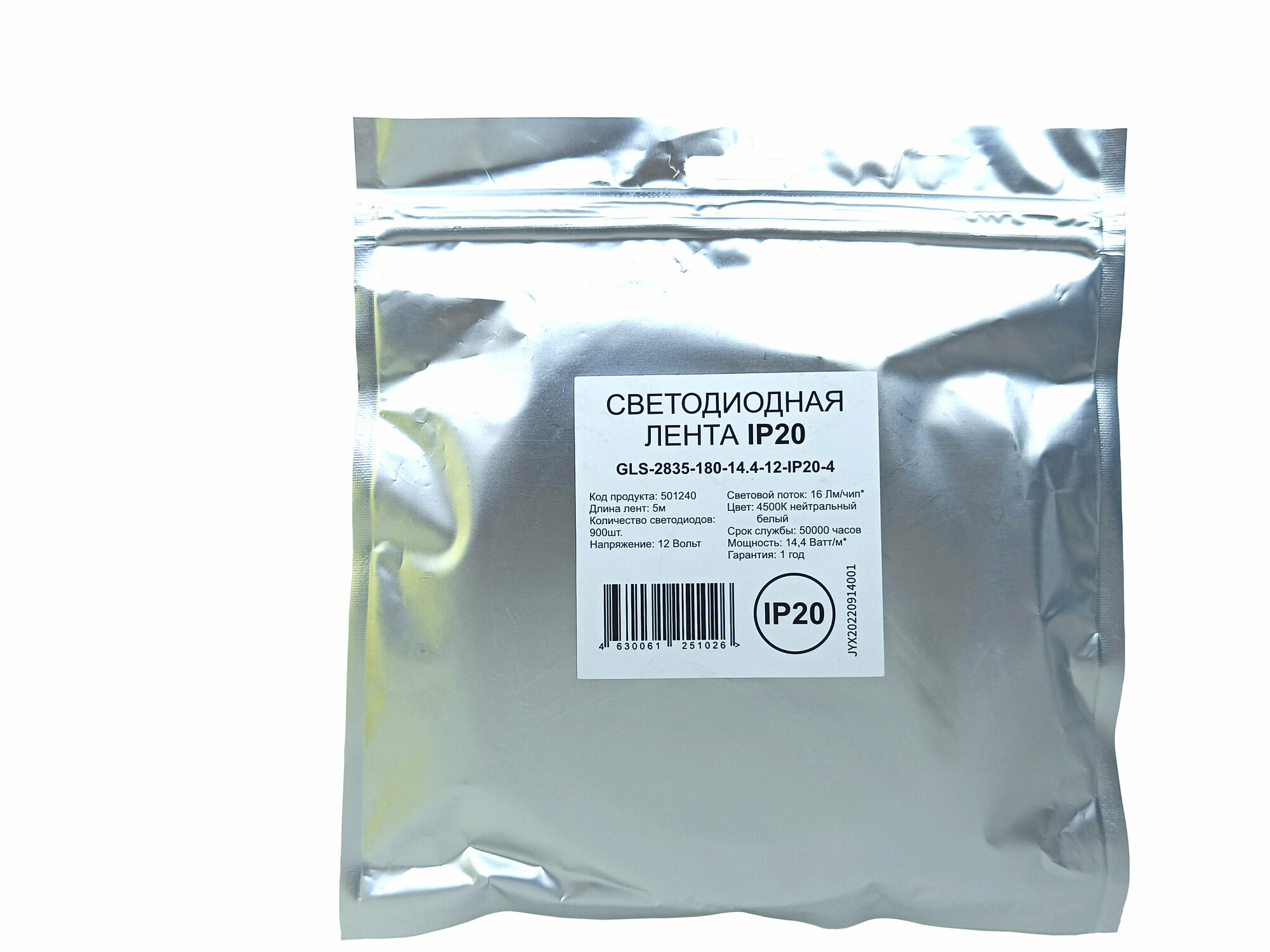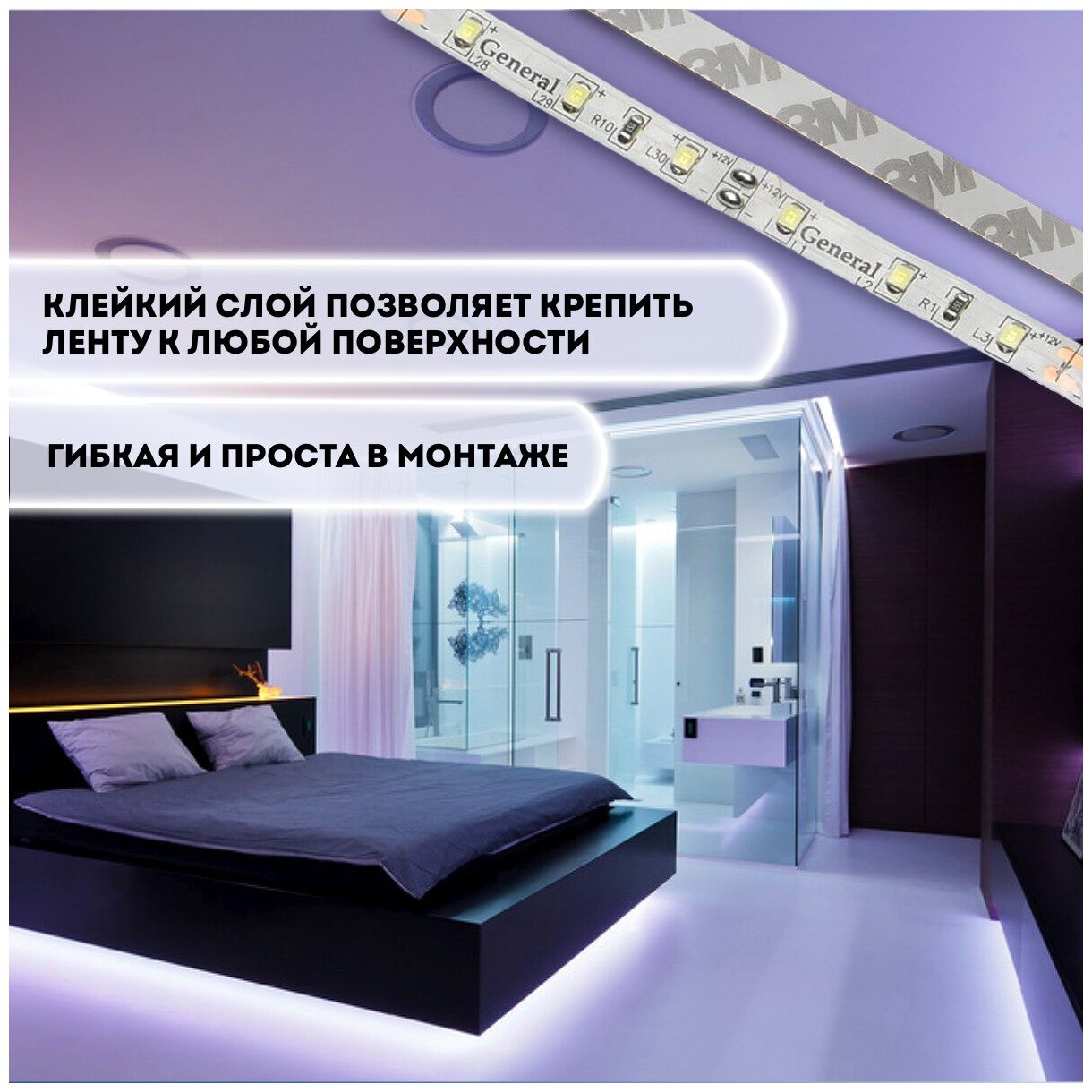 5м. Светодиодная лента белого цвета 4500K 2835 14.4W 12V 180LED/m IP20 General GLS-2835-180-14.4-12-IP20-4 (501240)