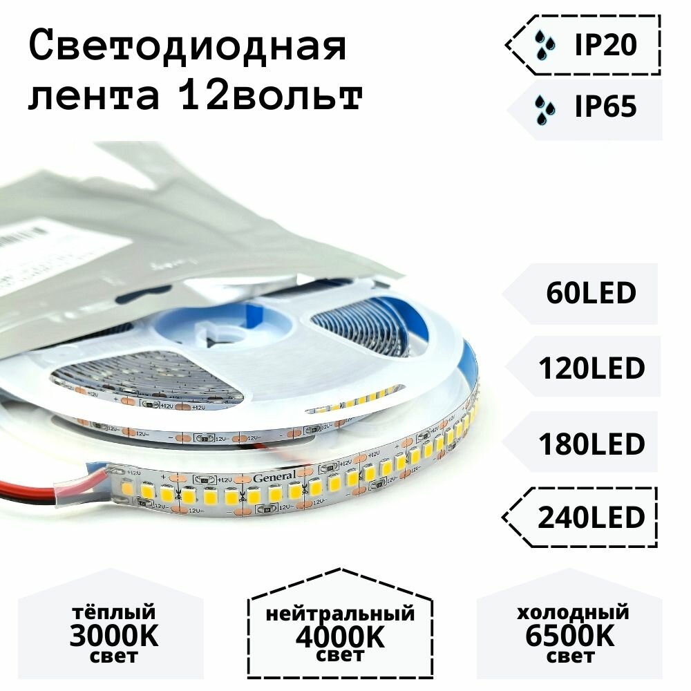 Светодиодная лента TM General - это гибкое основание белого или медного цветов с токопроводящими дорожками и равномерным распределением диодов по всей длине. Светодиодные ленты представляют собой надёжные, компактные и электробезопасные источники света с длительным сроком службы. На обратной стороне ленты нанесён клейкий слой, что даёт возможность прикрепить её к любой гладкой поверхности (стекло, гипсокартон, и так далее). Использование дополнительных аксессуаров для ленты облегчит монтаж и избавит от пайки, а благодаря гибкости и простоте монтажа, в сочетании с относительно невысокой стоимостью, ленты давно завоевали популярность, как среди дизайнеров, так и среди любителей декоративной подсветки. Светодиодная лента GENERAL GLS-2835-240-19,2-12-IP20-3 3000К 5м Светодиодная лента GENERAL GLS-2835-240-19,2-12-IP20-3 3000К 5м