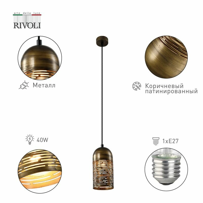 Светильник подвесной итальянского бренда Rivoli из коллекции Lamia, идеально подходящей для стилей модерн, лофт, кантри, восточный, ретро. Подвесной светильник Lamia Rivoli имеет 1 металлический плафон с декоративной перфорацией в виде тонких горизонтальных линий. Цвет светильника потолочного подвесного Lamia - коричневый с эффектом патины. Подвесные светильники Rivoli Lamia на тросах регулируются по высоте в процессе установки. Лампы для данных подвесных светильников над столом - Е27 мощностью 40 Вт. Великолепным решением для кухни станут такие подвесные светильники из металла. Светильники потолочные подвесные - важный атрибут современного дизайна интерьеров. Подвесные светильники на тросах Rivoli Lamia помогут поделить большое пространство на функциональные зоны, поэтому удачны для квартиры-студии или загородного дома. /
