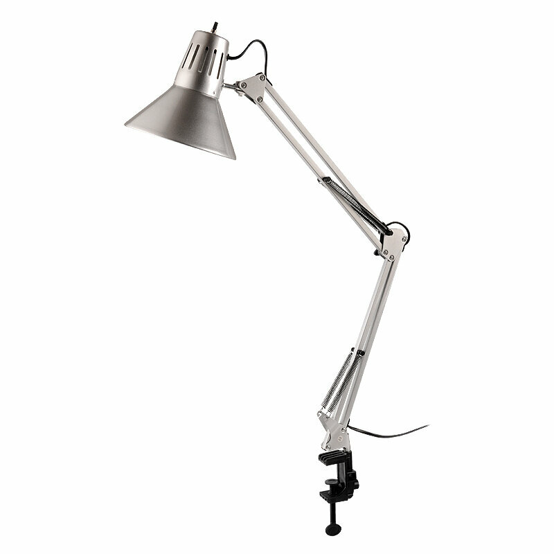 Настольный двухколенный светильник. Мощность до 60 Вт. Можно использовать любую лампу с цоколем Е 27, в том числе светодиодную. Лампа в комплект не входит. Световой поток зависит от типа лампы. Размер (диаметр основания, высота) : (148*148)*600 мм. Цвет : серебристый. Степень защиты IP 20. Длина шнура 1,2 м. Напряжение 220 В. Отлично подходит для работы и учебы. Максимальные возможности настройки по высоте и наклону.