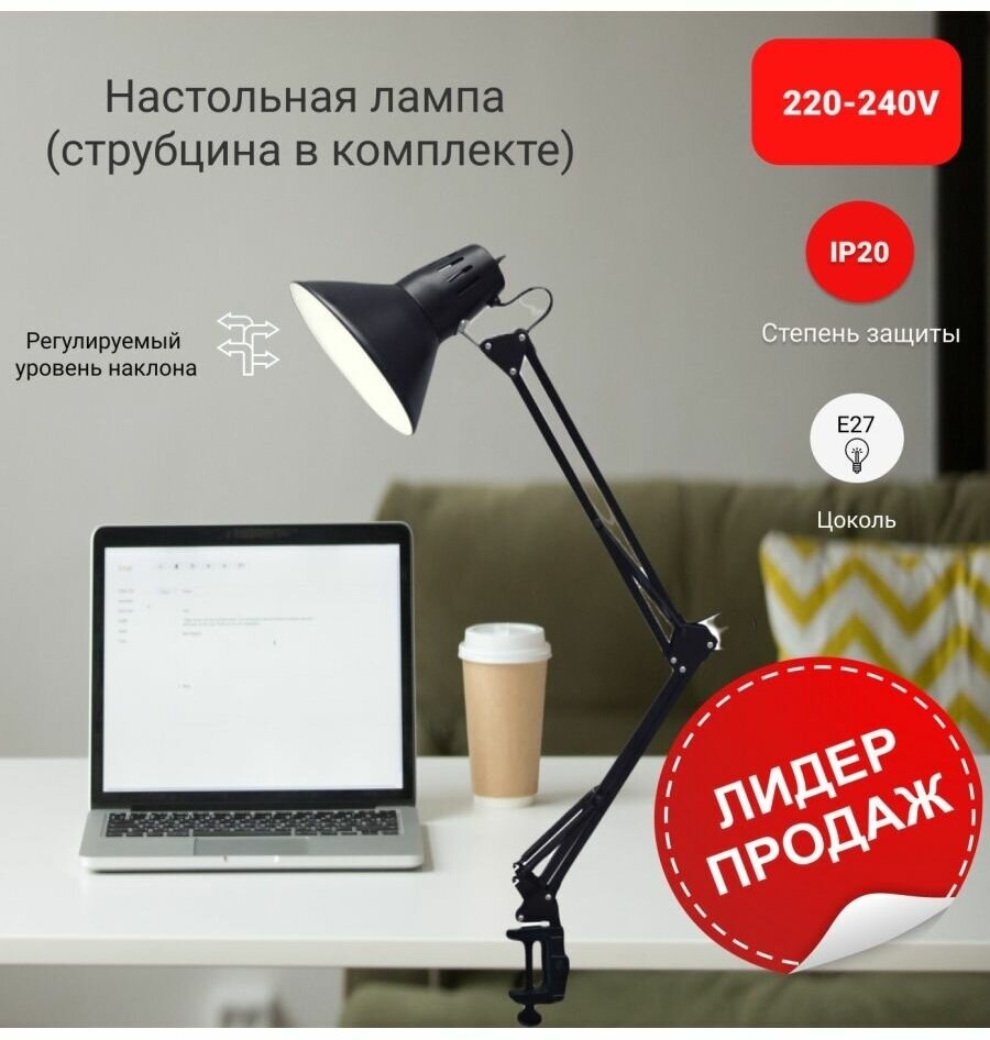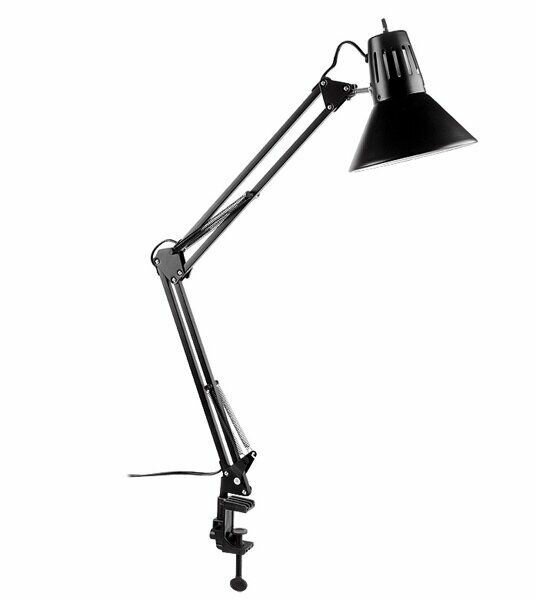 Настольный двухколенный светильник. Мощность до 60 Вт. Можно использовать любую лампу с цоколем Е 27, в том числе светодиодную. Лампа в комплект не входит. Световой поток зависит от типа лампы. Размер (диаметр основания, высота) : (148*148)*600 мм. Цвет : черный. Степень защиты IP 20. Длина шнура 1,2 м. Напряжение 220 В. Отлично подходит для работы и учебы. Максимальные возможности настройки по высоте и наклону.