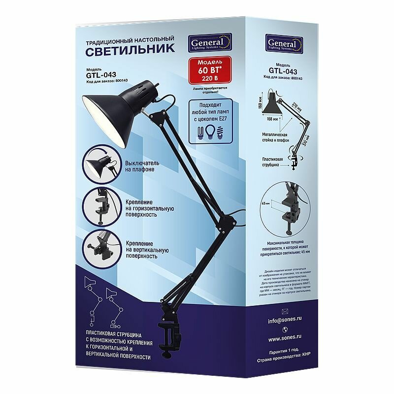 Настольная лампа на струбцине General GTL-043 черный 800143