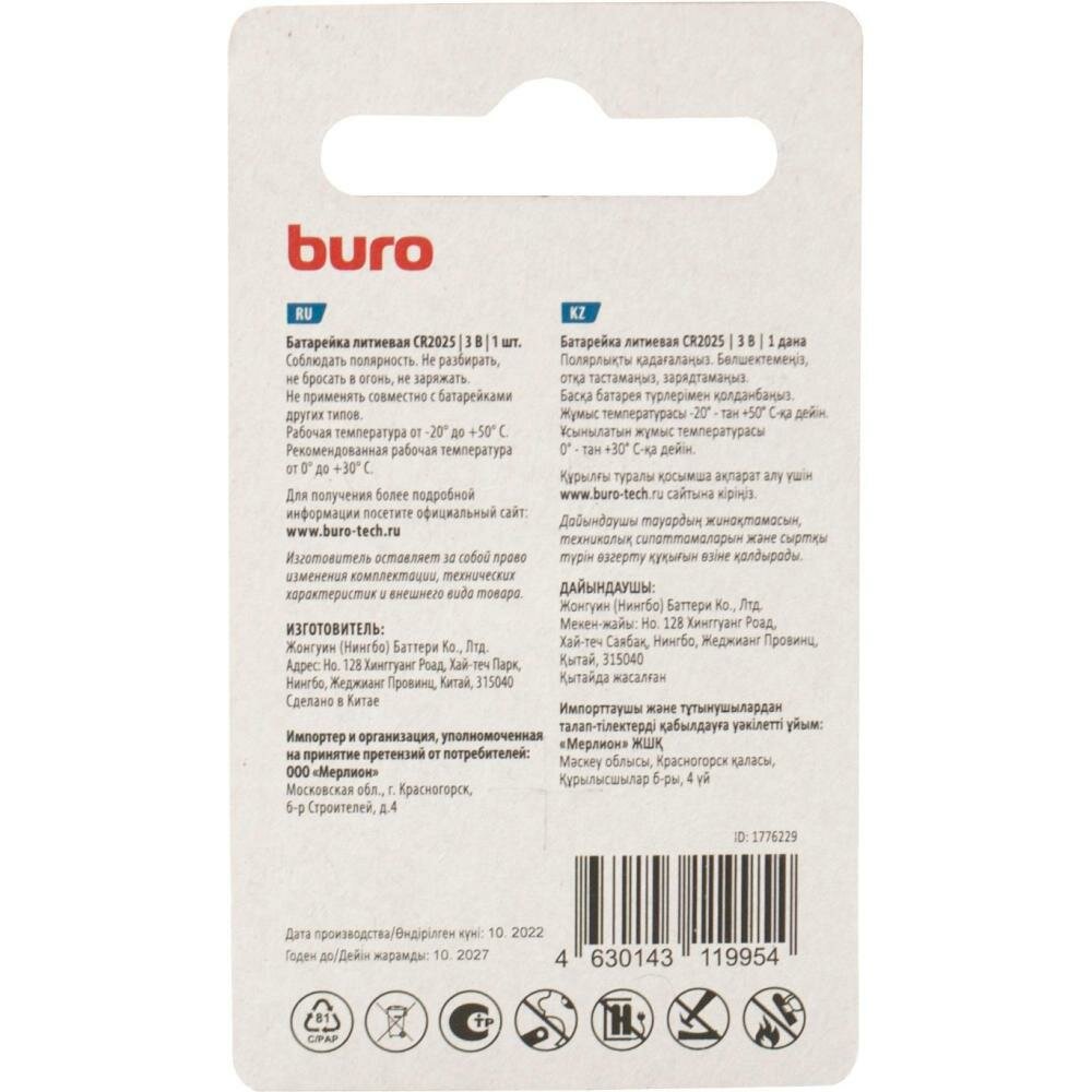Батарея Buro Lithium CR2025 (1шт) блистер Lithium CR2025 (1776229)