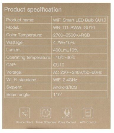 Светодиодная лампа GU10 Moes Smart LED Bulb GU10 модели WB-TD-RWW-GU10