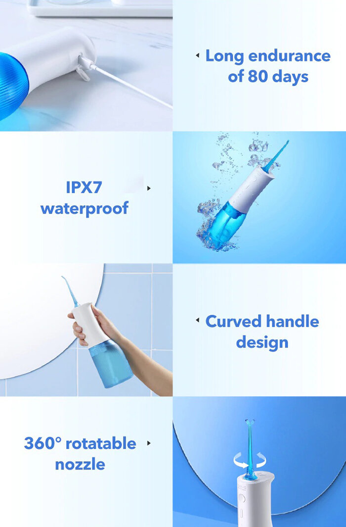 Благодаря компактному размеру и возможностью заряжаться от любого устройства с USB зарядкой ирригатор удобно брать в поездки. Встроенный аккумулятор держит заряд до 30 дней. Корпус ирригатора имеет защиту от влаги IPX7, что позволяет использовать его прямо в душе.
