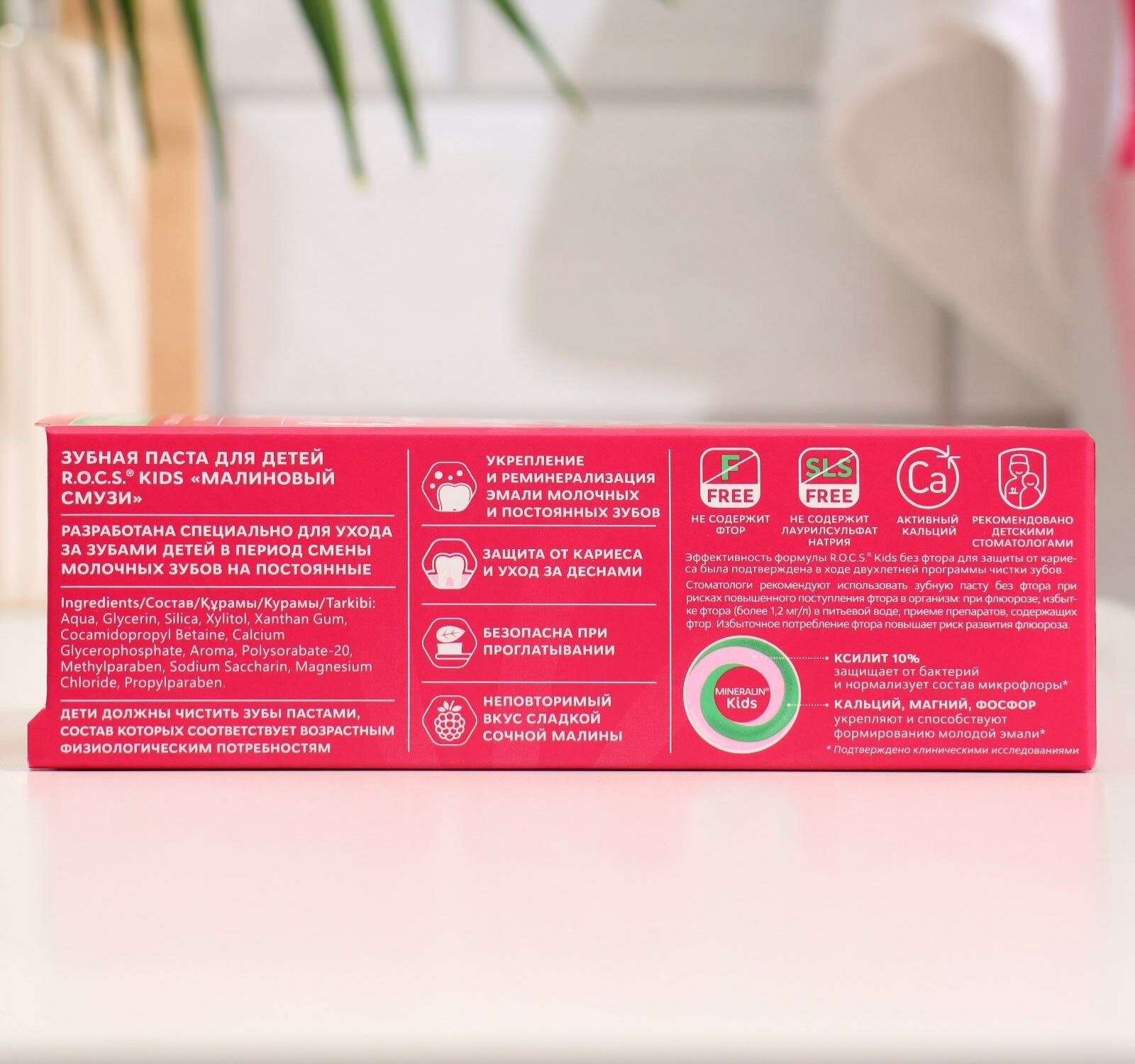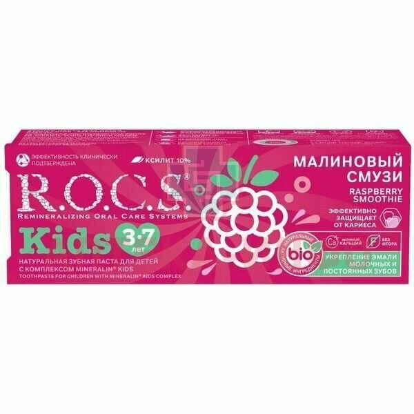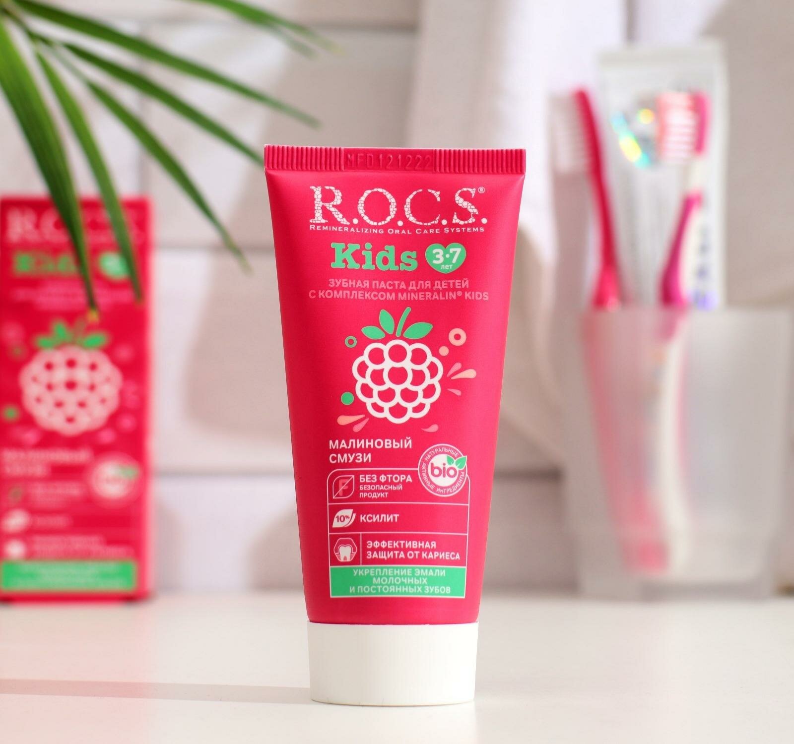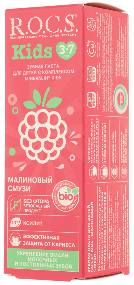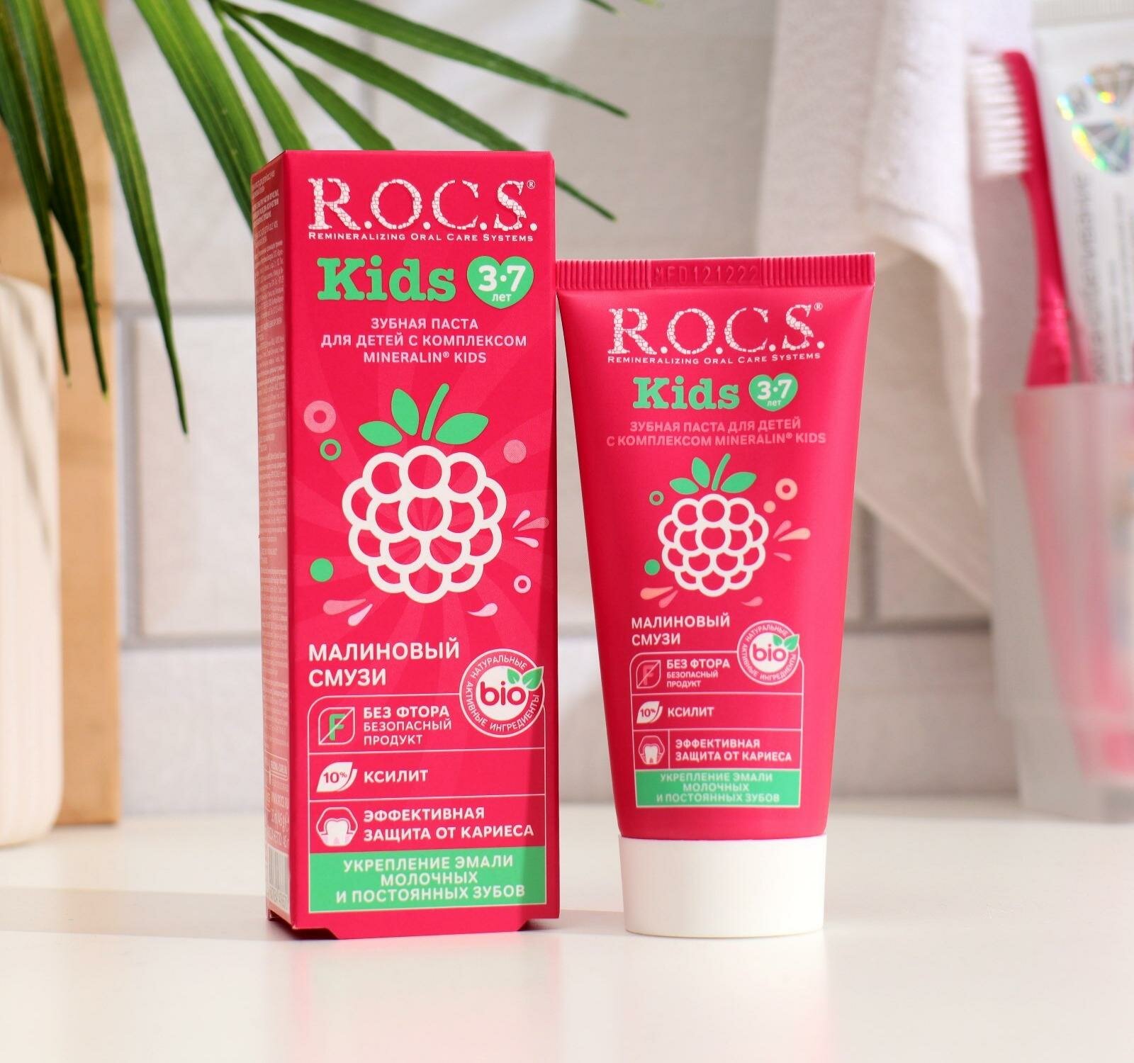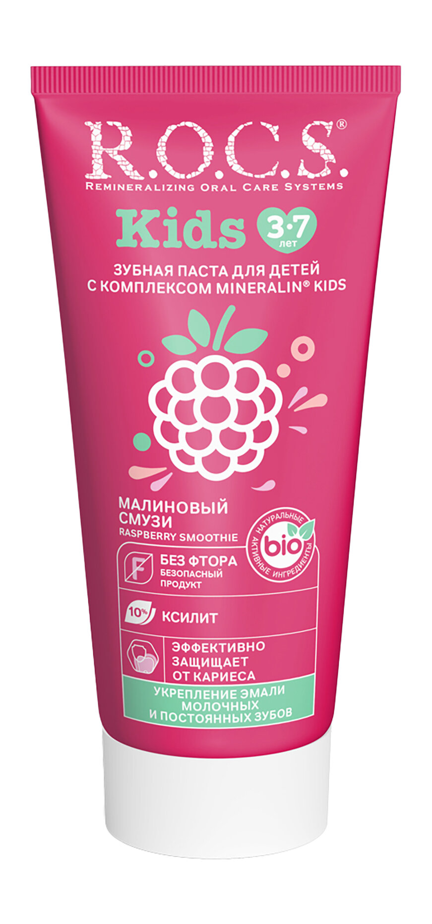 Приятный вкус зубной пасты ROCS , напоминающий душистую малину, низкоабразивная формула и уникальный состав позволяют обеспечить правильный и приятный уход за полостью рта ребенка, начиная с 3-х лет; защитить зубы от кариеса и приучить малыша к ежедневной гигиене ротовой полости без уговоров и нареканий.