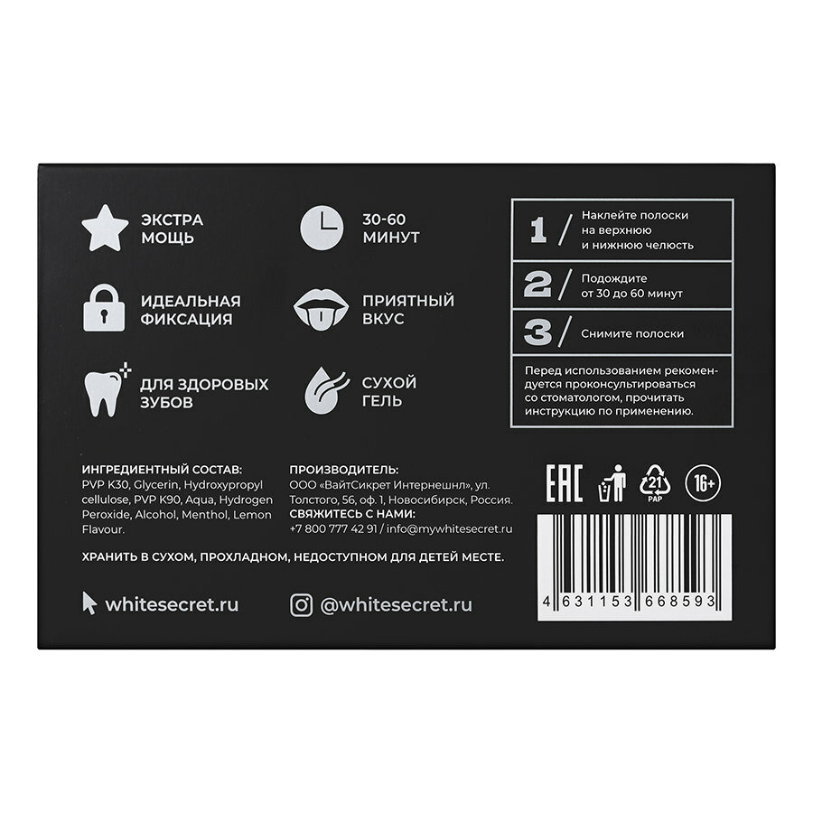 Отбеливающие полоски White Secret — самые мощные полоски в линейке бренда! Максимальный результат плюс идеальная фиксация на зубах дают действительно сильный результат на 4-8 тонов при приятном использовании.