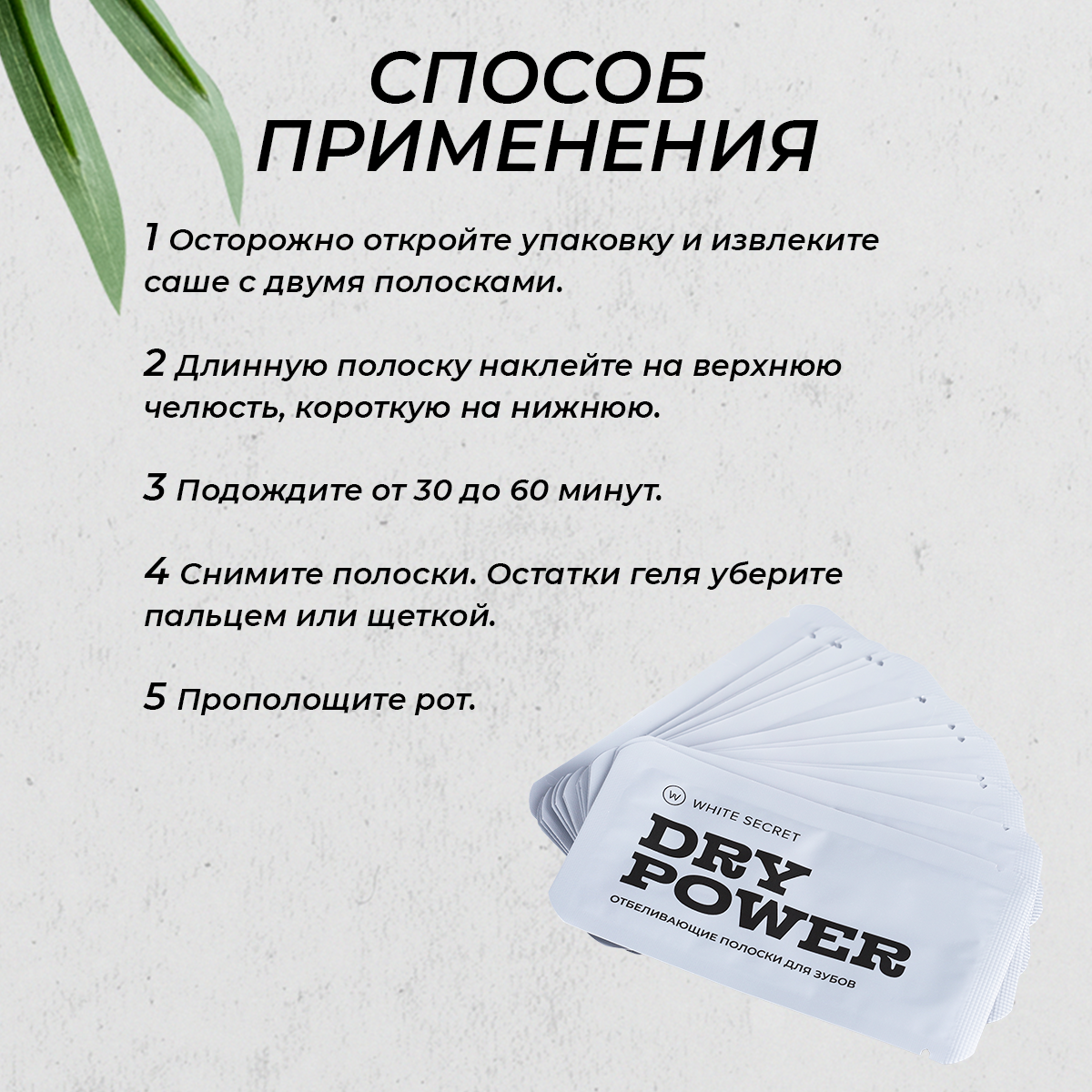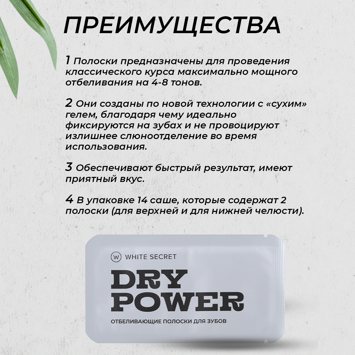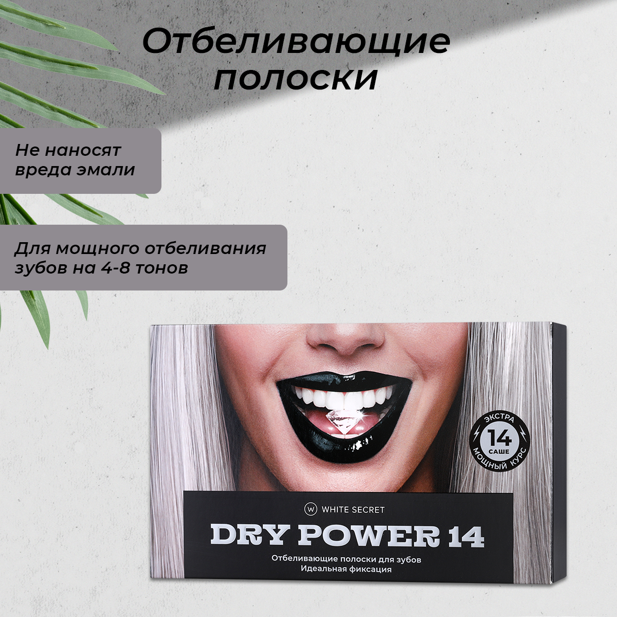 | Состав набора | White Secret, Отбеливающие полоски Dry Power 14 - 14 саше, которые содержат 2 полоски (для верхней и для нижней челюсти) |