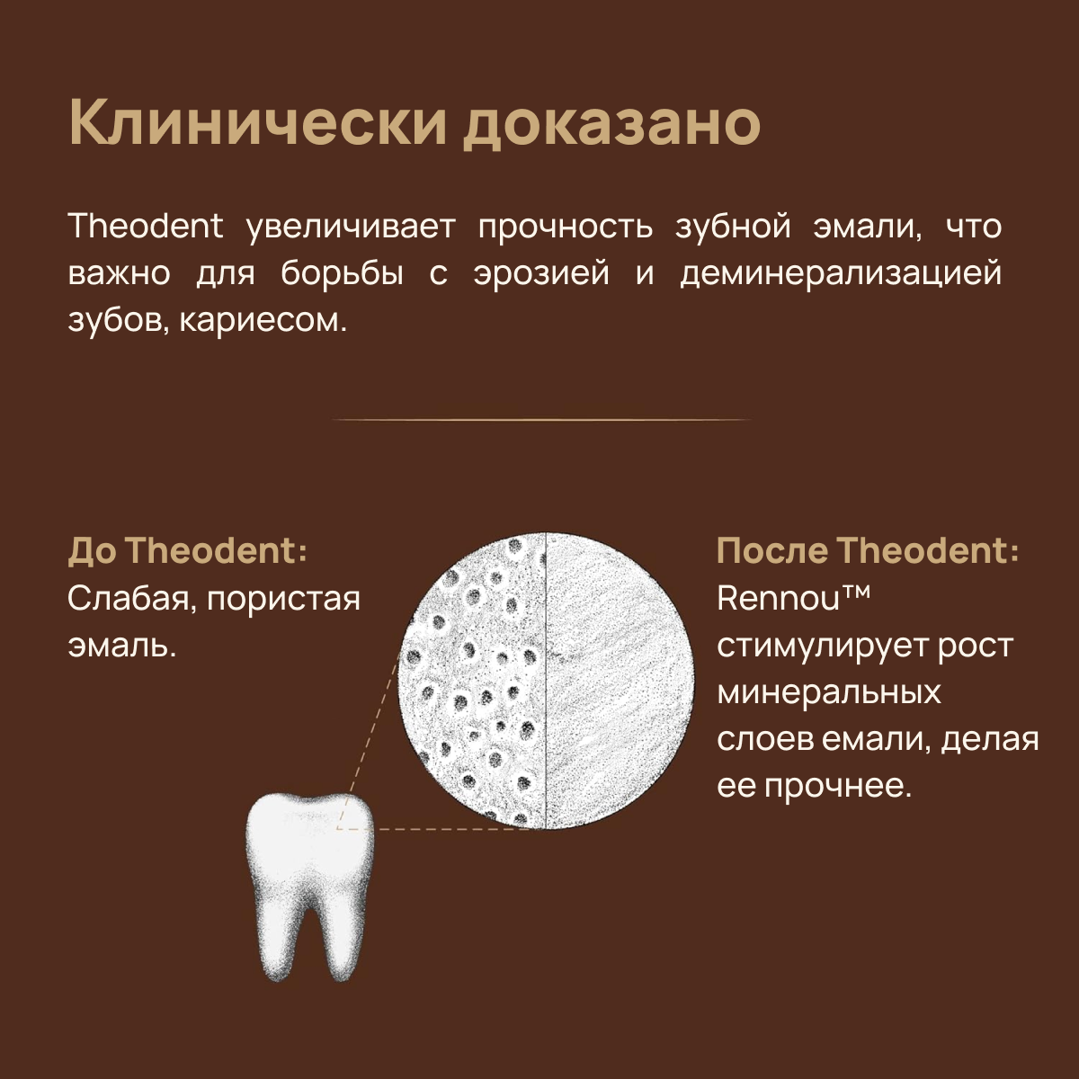 Зубная паста Theodent на основе теобромина - эффективное средство не только профилактики кариеса, но и его лечения на раннем этапе. Ее большое преимущество в том, что она останавливает и обращает процесс развития заболевания в стадии белого пятна: всего через 7 дней применения Theodent кариозные пятна начинают исчезать. Более 30 лет ведущий исследователь компании Theodent Тетсуо Накамото вел непрерывные клинические исследования, чтобы создать революционную формулу Rennou. На сегодняшний день она не имеет аналогов в мире.