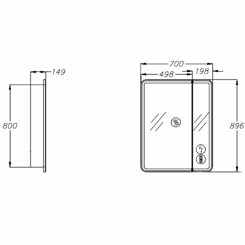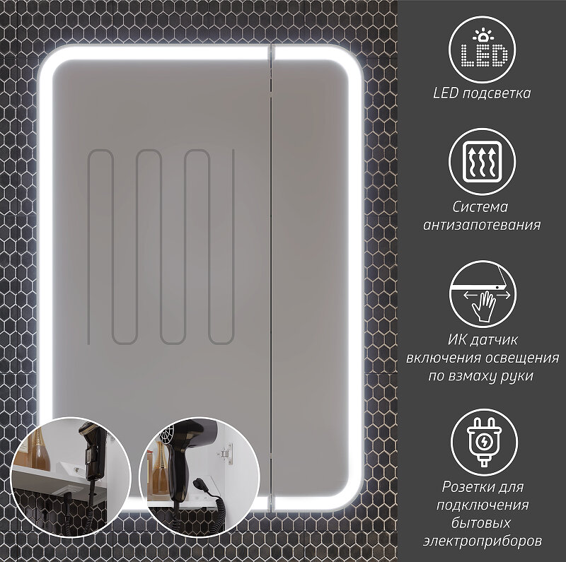 Зеркальный шкаф для ванной. Материал корпуса: МДФ. Покрытие корпуса: эмаль матовая. Система хранения: две распашные дверцы, стеклянные полки внутри шкафа. Тип подсветки: LED. ИК датчик включения освещения по взмаху руки. Система антизапотевания. Две розетка для подключения электробытовых приборов