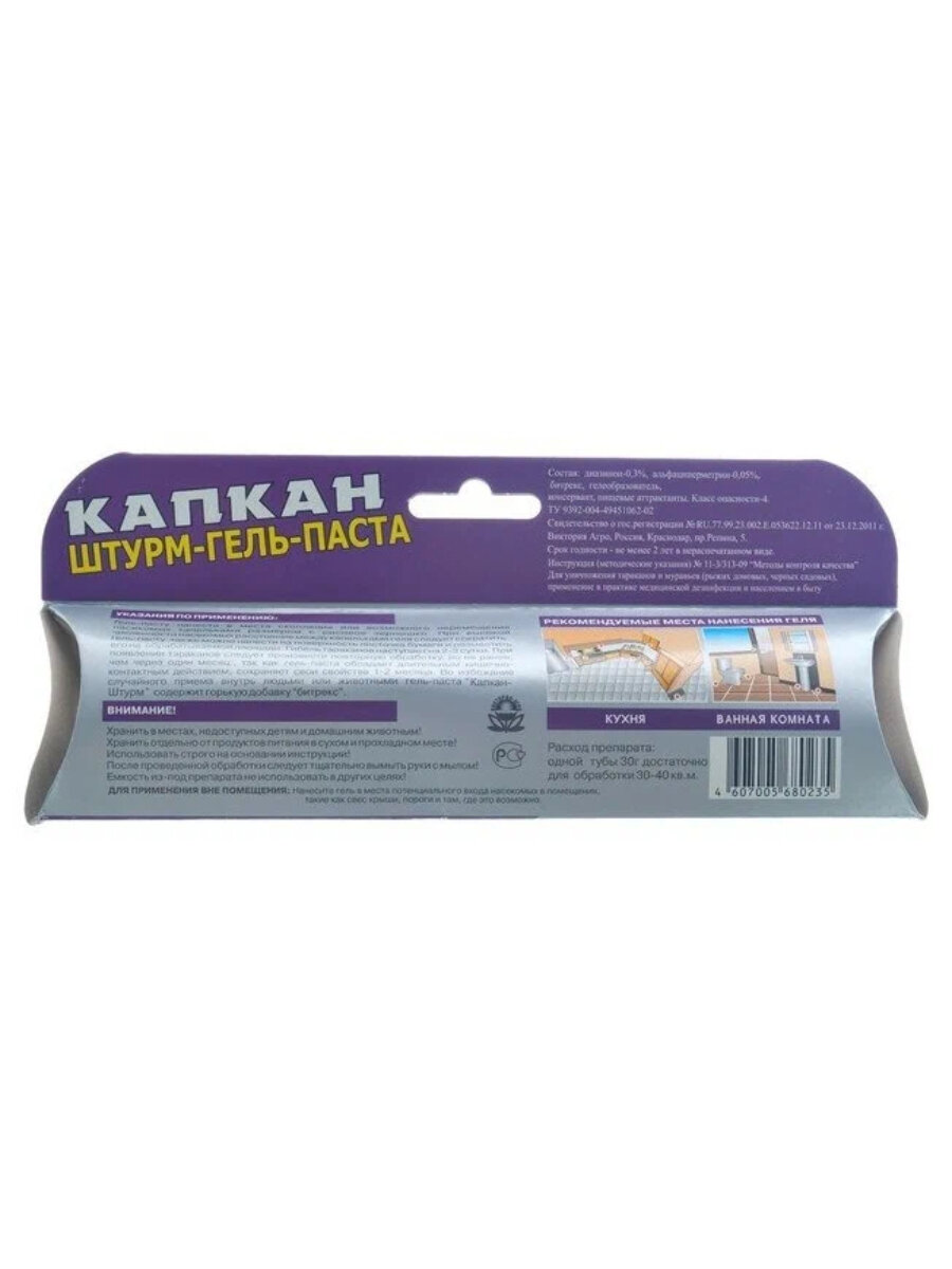 Гель от тараканов и муравьев Капкан–Штурм шприц 30 г. Капкан Штурм - гель-паста (30г) - это надежное и эффективное инсектицидное средство, для уничтожения всех видов тараканов и муравьев.Указания по применению:Гель нанести в места скопления или возможного перемещения насекомых капельками размером с рисовое зернышко. При высокой численности насекомых расстояние между капельками геля следует сократить. Гель также можно нанести на поверхность листочка бумаги и разместить его на обрабатываемой площади. Гибель тараканов наступает на 2 – 3 сутки. При появлении тараканов следует произвести повторную обработку, но не ранее, чем через один месяц, т. к гель обладает длительным кишечно – контактным действием, сохраняет свои свойства 1-2 месяца. Во избежание случайного приема внутрь людьми или животными гель содержит горькую добавку «битрекс».