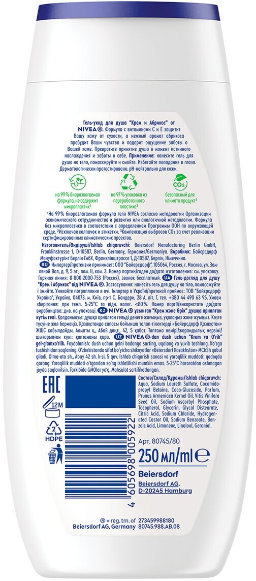 Когда хочется, чтобы после душа тебя обволакивало ароматное облако, а кожа была нежной и красивой, выбирай гель-уход для душа NIVEA Крем и Абрикос. В составе с натуральным маслом абрикосовых косточек он заботится о коже, делая ее невероятно мягкой. Сбалансированный pH предотвращает пересушивание кожи, поддерживая ее естественный уровень увлажненности. А нежный аромат абрикоса пробудит Ваши чувства. Превратите ежедневное принятие душа в момент истинного наслаждения и заботы о коже. Обновленная биоразлагаемая формула не содержит микропластик, потому что мы заботимся не только о красоте и здоровье кожи, но и об окружающей среде! Мы хотим менять мир к лучшему и ставим перед собой амбициозные цели в сфере защиты окружающей среды. Исследователи NIVEA постоянно совершенствуют формулы, чтобы сделать наши средства максимально подходящими для кожи, одновременно минимизируя уровень их воздействия на природу.