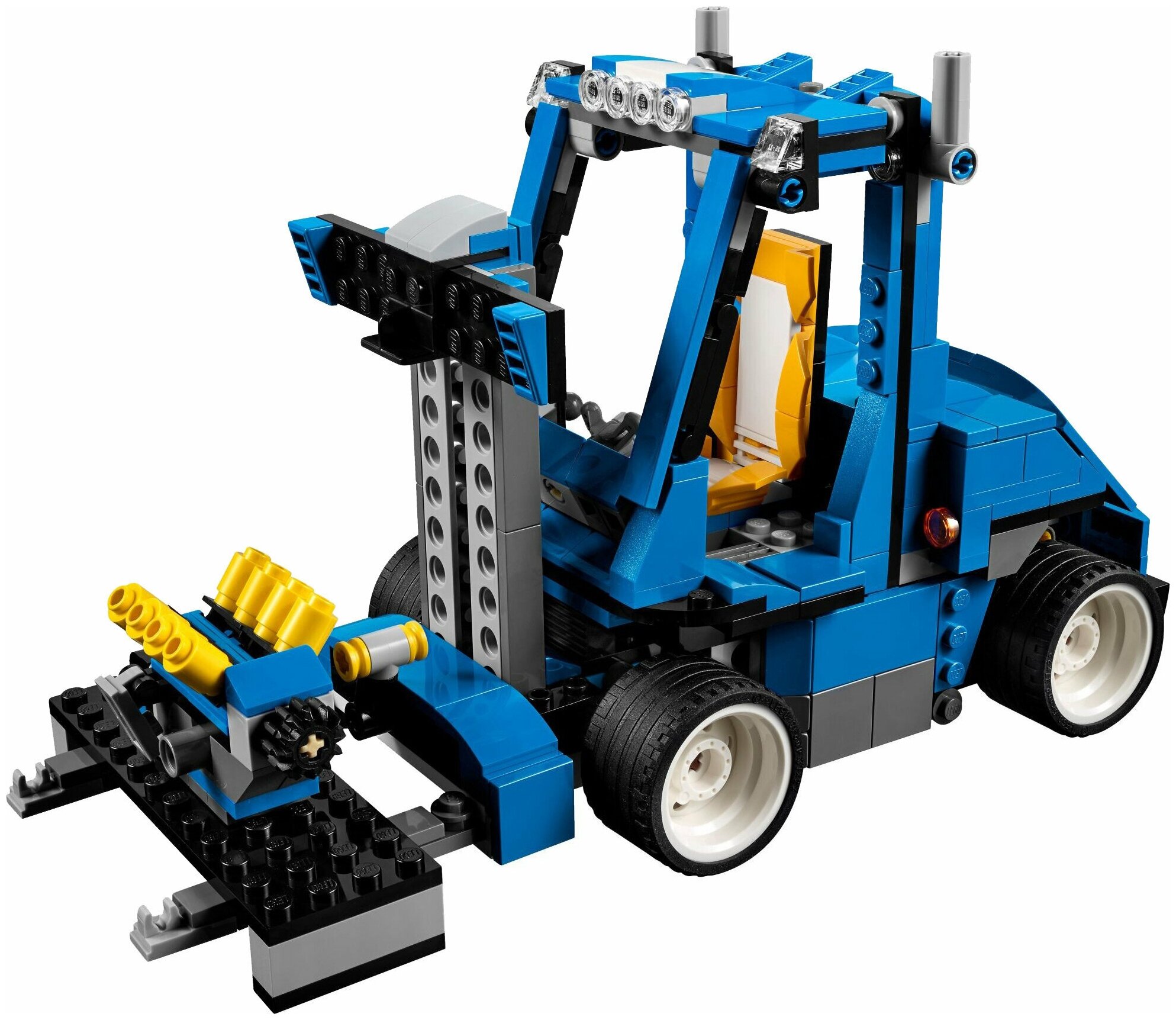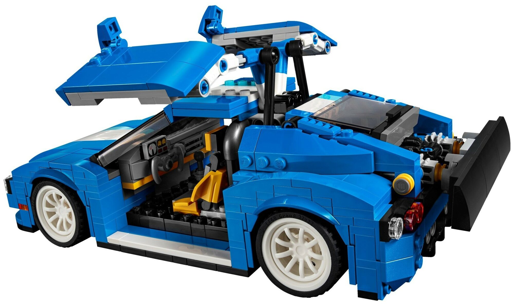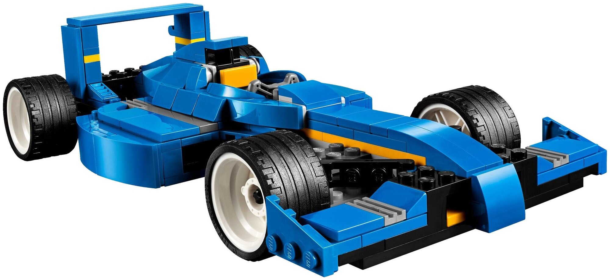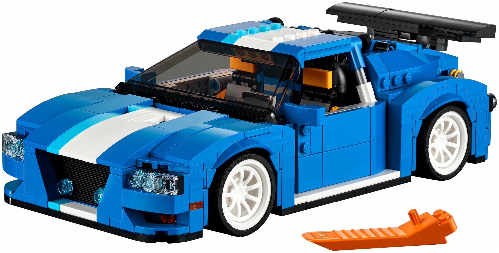 Выиграй гонку на этом суперкрутом синем гоночном автомобиле с широкой белой полосой, черным задним спойлером, стильными черно-белыми колесным дисками и низкопрофильными шинами. Нажми на спойлер, чтобы открыть двери и заглянуть в салон автомобиля, где ты увидишь спортивное рулевое колесо, спидометр, работающий механизм переключения передач, рычаг стояночного тормоза и огненно-жёлтые с серым регулируемые гоночные сидения и каркас безопасности. Открой задний капот, чтобы посмотреть на огромный двигатель с хромированными решётками и двигающимися деталями. Детально прорисованные фары и задние огни, откидывающийся верх, зеркала заднего вида и тонированное ветровое стекло добавляют последние штрихи к дизайну этой впечатляющей модели 3 в 1. Модель можно перестроить в Автопогрузчик или крутой Синий болид.