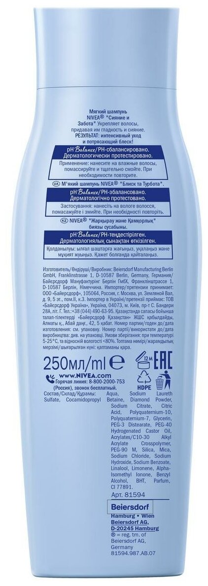 Почувствуйте заботу о ваших волосах! С обновленной линейкой средств по уходу за волосами от NIVEA ваши волосы выглядят красивыми и здоровыми, и к ним приятно прикасаться. Для волос средней длины и длинных волос. Волосы средней длины и длинные волосы могут выглядеть тусклыми и безжизненными, лишенными блеска и мягкости. Шампунь с Микрочастицами Бриллиантов и Жидким Кератином: придает волосам многогранный бриллиантовый блеск, мягко очищает и ухаживает за волосами, делает волосы мягкими и послушными. Жидкий Кератин восстанавливает структуру волоса по всей длине и глубоко питает волосяные луковицы, обеспечивая здоровый рост волос и защищая их от негативного воздействия окружающей среды.