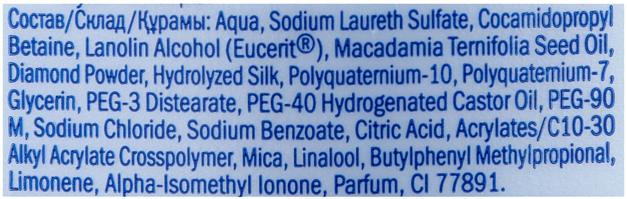 | Состав | aqua; sodium laureth sulfate; cocamkjopropyl betaine; sodium chloride; hydrolyzed keratin; bambusa vulgaris shoot extract; polyquaternium-10; guar hydroxypropyltrimo-nium chloride; glycerin. propylene glycol; peg-40 hydrogenated castor oil; sodium benzoate; citric acid; benzyl alcohol; citronellol; parfum |