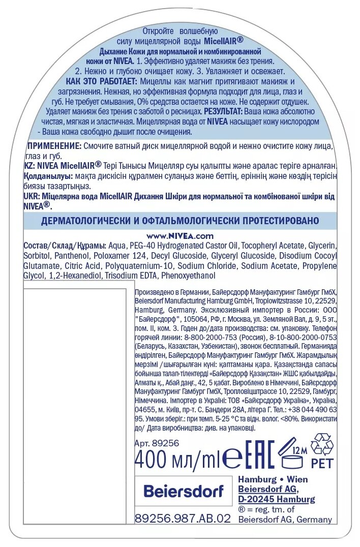 Мицеллярная вода - новое слово в очищении кожи, сочетающее в себе удобство, эффективность и безопасность. Благодаря специальным микрочастицам - мицеллам - мицеллярная вода одним движением обеспечивает особо эффективное очищение без трения и раздражения. Обогащенная витамином Е, мицеллярная вода от NIVEA удаляет макияж с лица и глаз, глубоко очищает и ухаживает, увлажняет и освежает. Мицеллярная вода не содержит паробенов, силикона и отдушек.