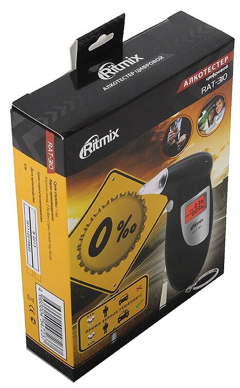 | Дополнительно | Алкотестер Ritmix RAT-310 предназначен для проведения персонального измерения концентрации алкоголя в парах выдыхаемого воздуха. Прибор пересчитывает полученные данные на концентрацию алкоголя в крови и выдает результат на цифровой дисплей. |